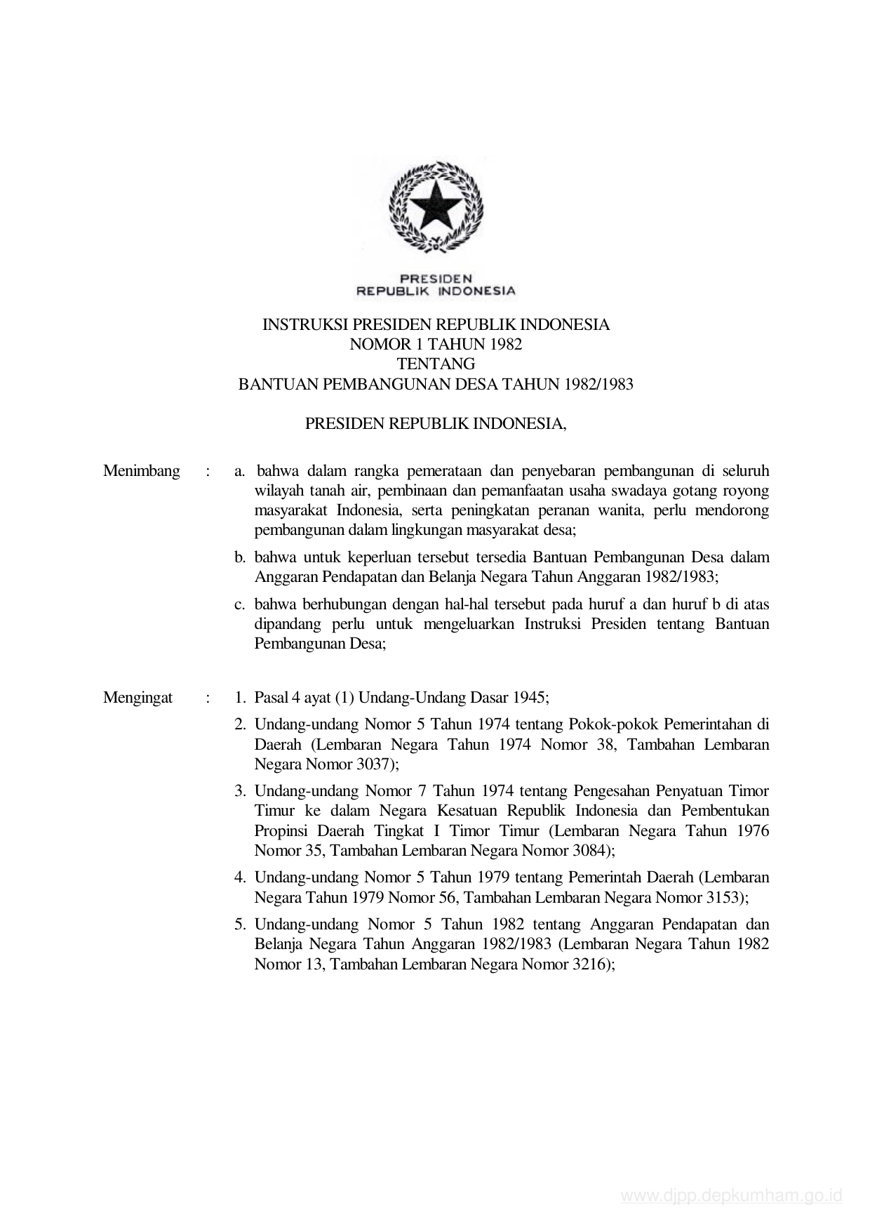 INPRES Nomor 1 Tahun 1982 | Instruksi Presiden Nomor 1 Tahun 1982 tentang BANTUAN PEMBANGUNAN DESA TAHUN 1982/1982