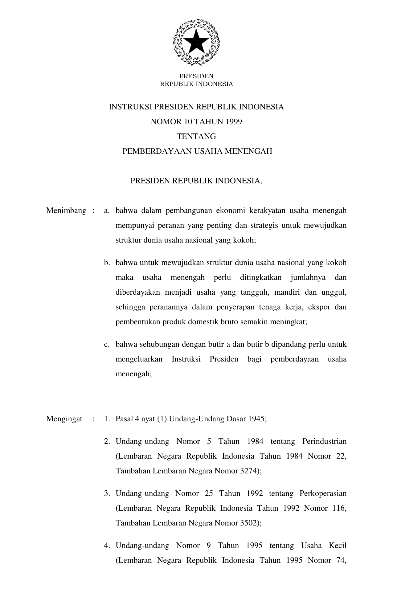 INPRES Nomor 10 Tahun 1999 | Instruksi Presiden Nomor 10 Tahun 1999 tentang PEMBERDAYAAN USAHA MENENGAH