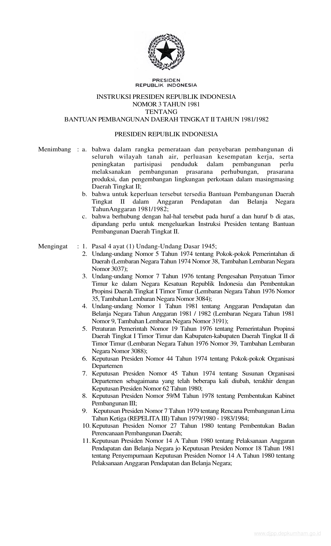 INPRES Nomor 3 Tahun 1981 | Instruksi Presiden Nomor 3 Tahun 1981 tentang BANTUAN PEMBANGUNAN DAERAH TINGKAT II TAHUN 1981/1982
