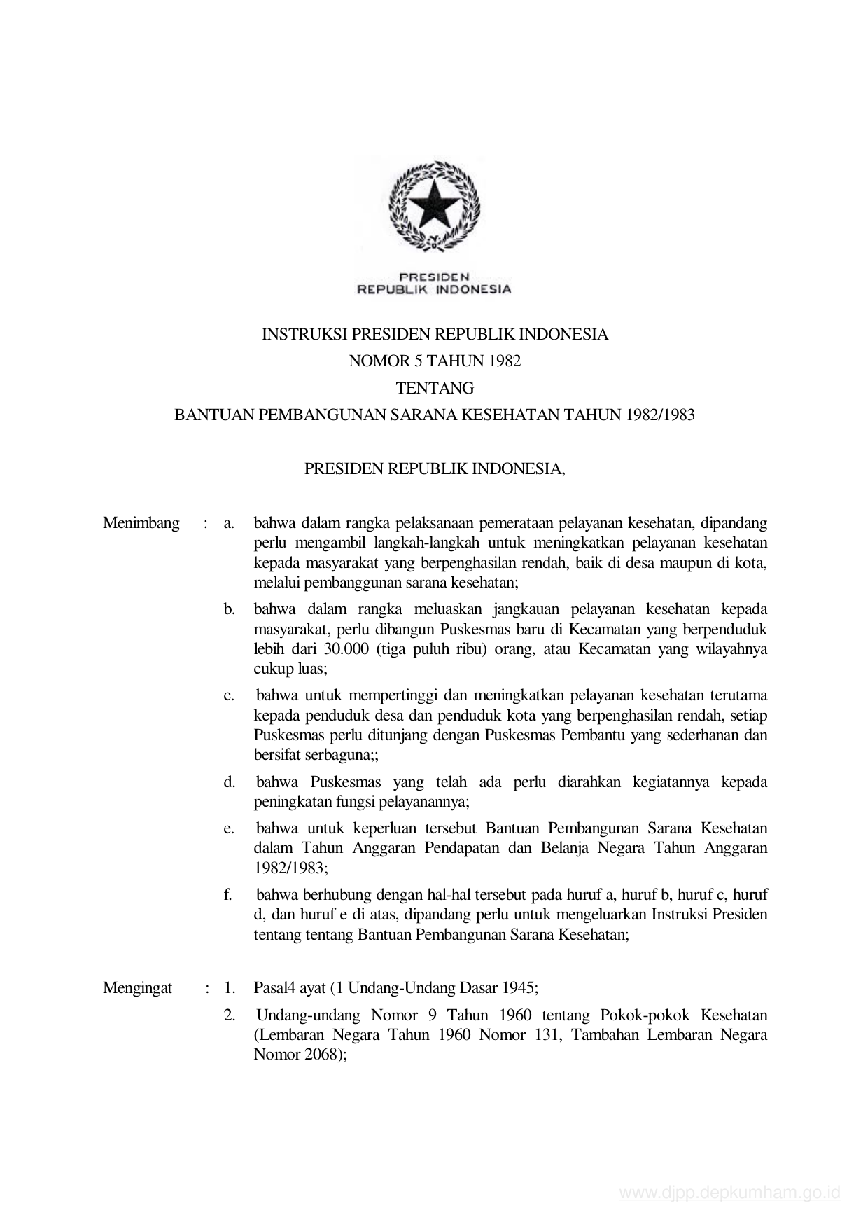 INPRES Nomor 5 Tahun 1982 | Instruksi Presiden Nomor 5 Tahun 1982 tentang BANTUAN PEMBANGUNAN SARANA KESEHATAN TAHUN 1982/1983