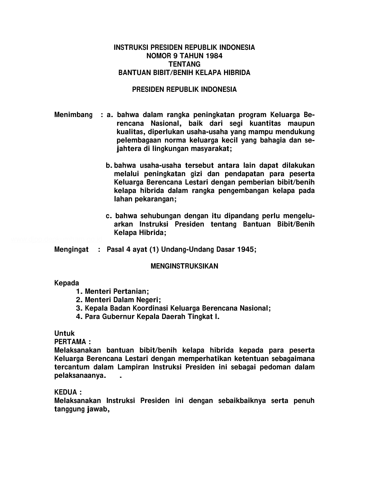 INPRES Nomor 9 Tahun 1984 | Instruksi Presiden Nomor 9 Tahun 1984 tentang BANTUAN BIBIT/BENIH KELAPA HIBRIDA