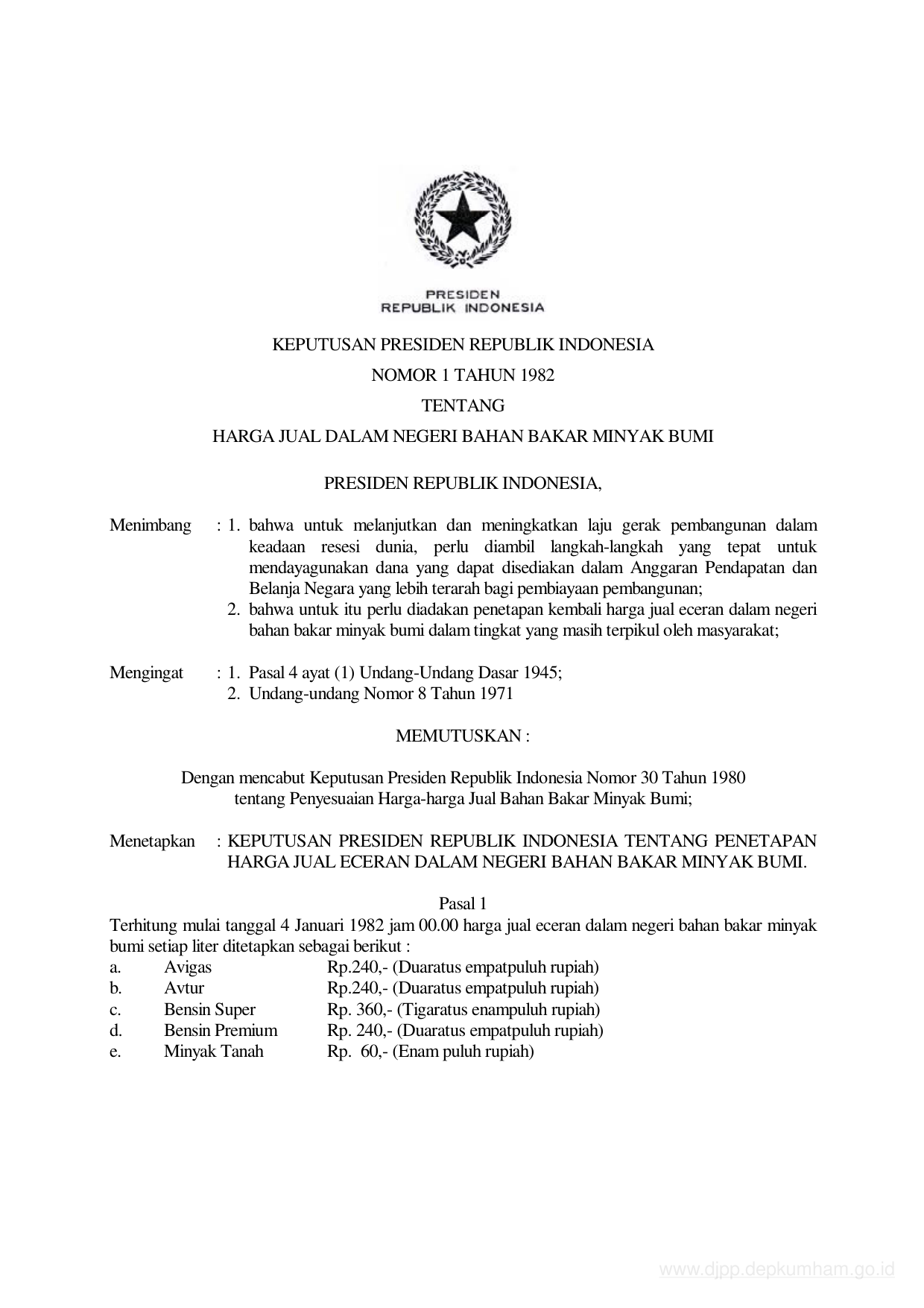KEPPRES Nomor 1 Tahun 1982 | Keputusan Presiden Nomor 1 Tahun 1982 tentang HARGA JUAL DALAM NEGERI BAHAN BAKAR MINYAK BUMI