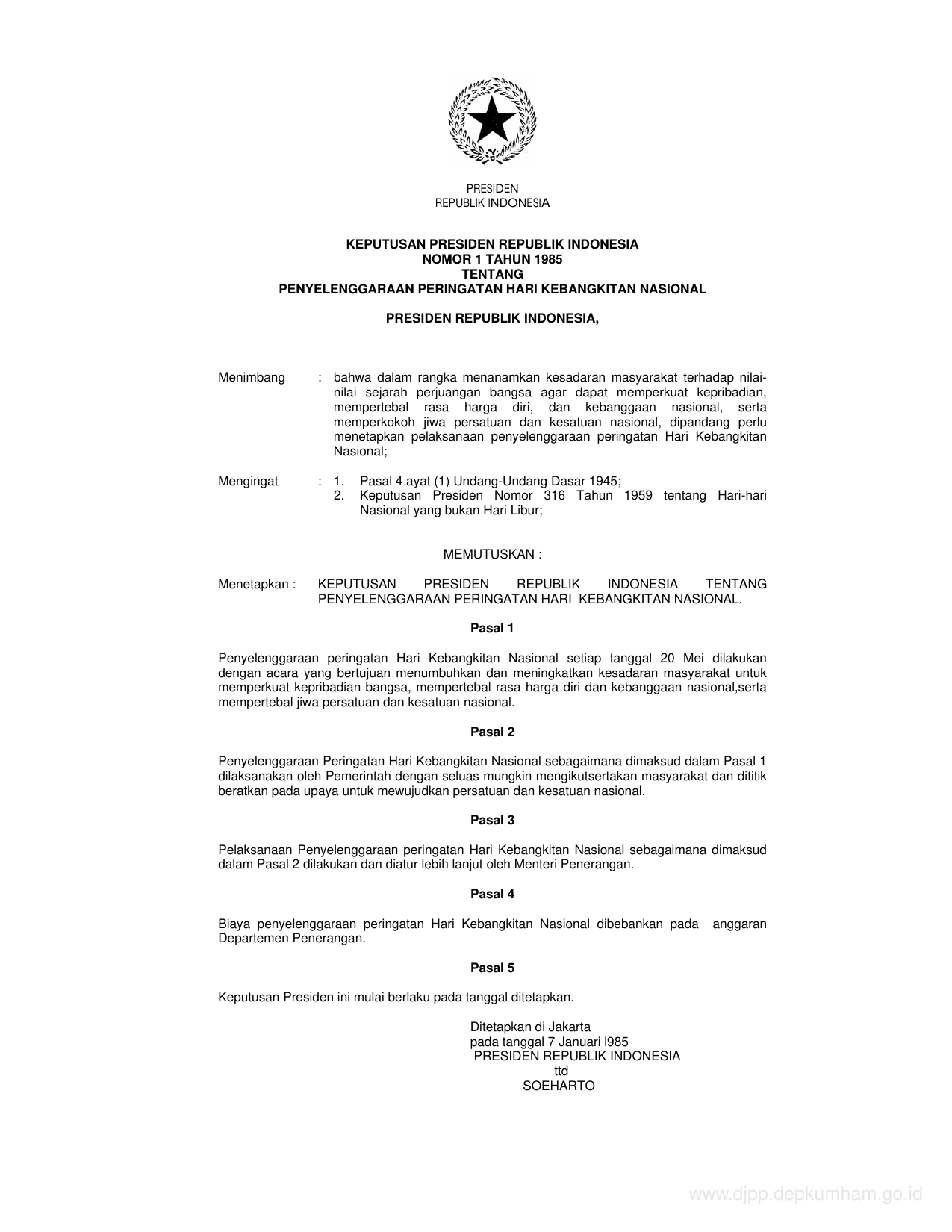 KEPPRES Nomor 1 Tahun 1985 | Keputusan Presiden Nomor 1 Tahun 1985 tentang PENYELENGGARAAN HARI KEBANGKITAN NASIONAL