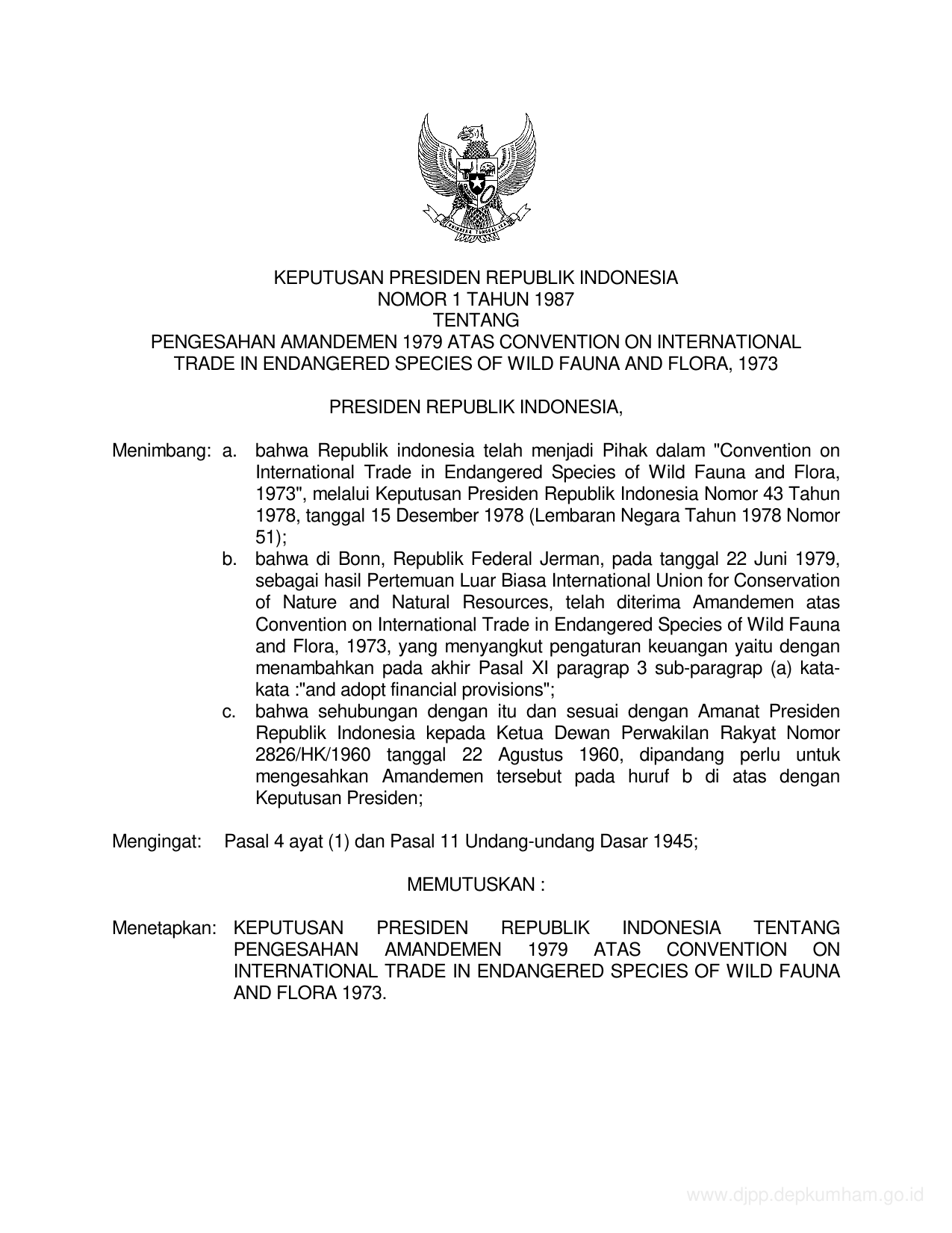 Mengesahkan Amandemen 1979 atas Convention on International Trade in Endangered Species of Wild Fauna and Flora, 1973, yang telah diterima di Bonn, Republik Federal Jerman, pada tanggal 22 Juni 1979, yang salinan naskah aslinya dalam bahasa Inggris sebagaimana terlampir pada Keputusan PRESIDEN ini.