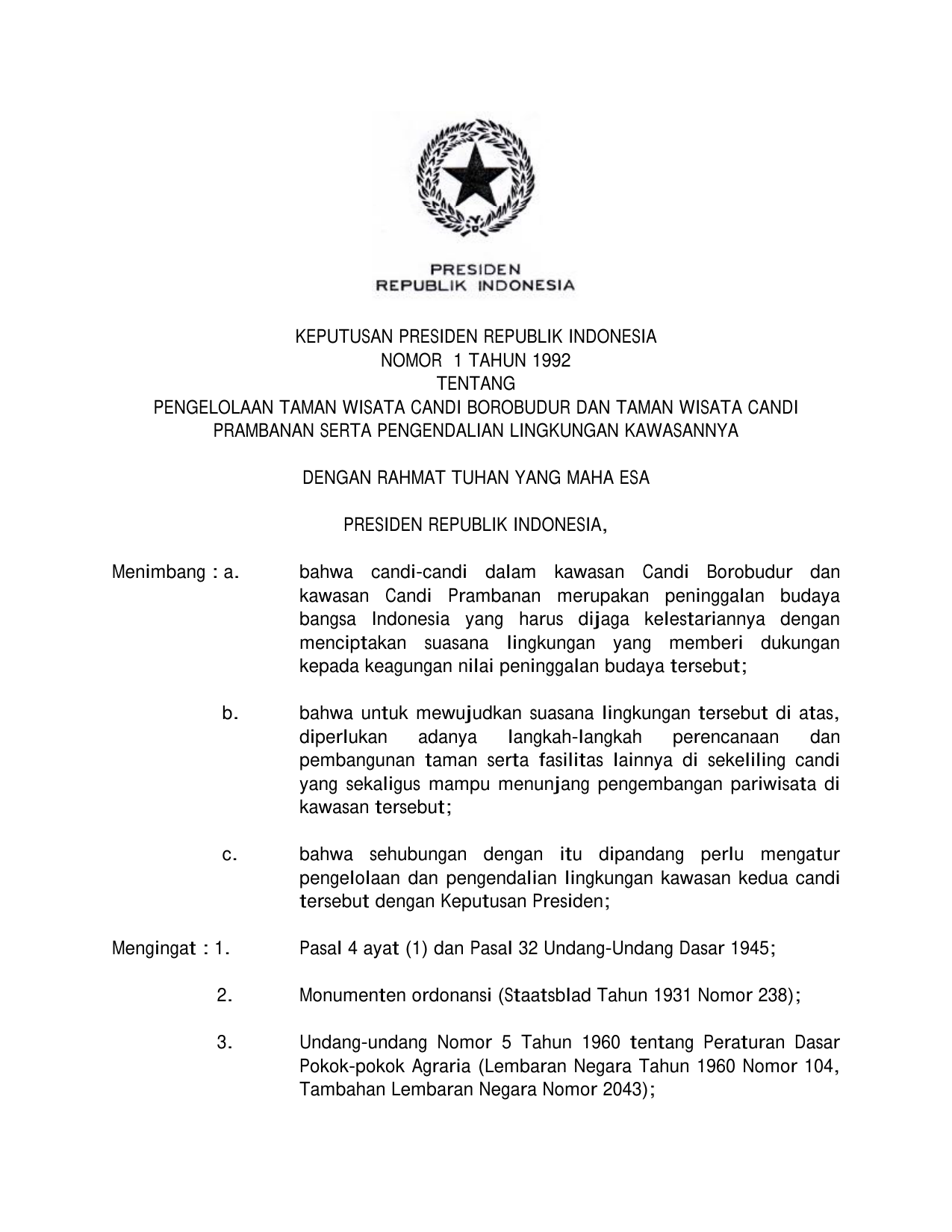 KEPPRES Nomor 1 Tahun 1992 | Keputusan Presiden Nomor 1 Tahun 1992 tentang PENGELOLAAAN TAAMAN WISATA CANDI BOROBUDUR DAN TAMAN WISATA CANDI PRAMBANAN SERTA PENGENDALIAN LINGKUNGAN KAWASANYA