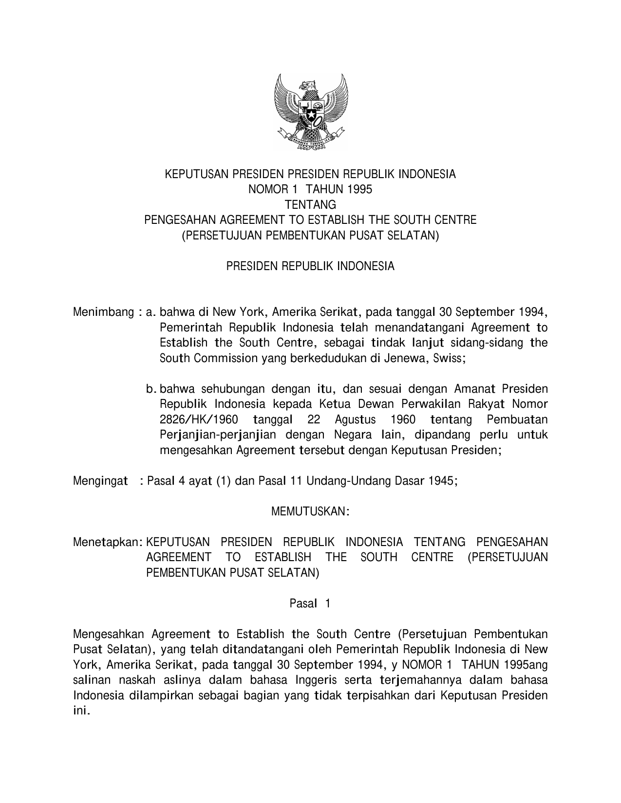 Mengesahkan Agreement to Establish the South Centre (Persetujuan Pembentukan Pusat Selatan), yang telah ditandatangani oleh Pemerintah Republik INDONESIA di New York, Amerika Serikat, pada tanggal 30 September 1994, y NOMOR 1 TAHUN 1995ang salinan naskah aslinya dalam bahasa Inggeris serta terjemahannya dalam bahasa INDONESIA dilampirkan sebagai bagian yang tidak terpisahkan dari Keputusan PRESIDEN ini.