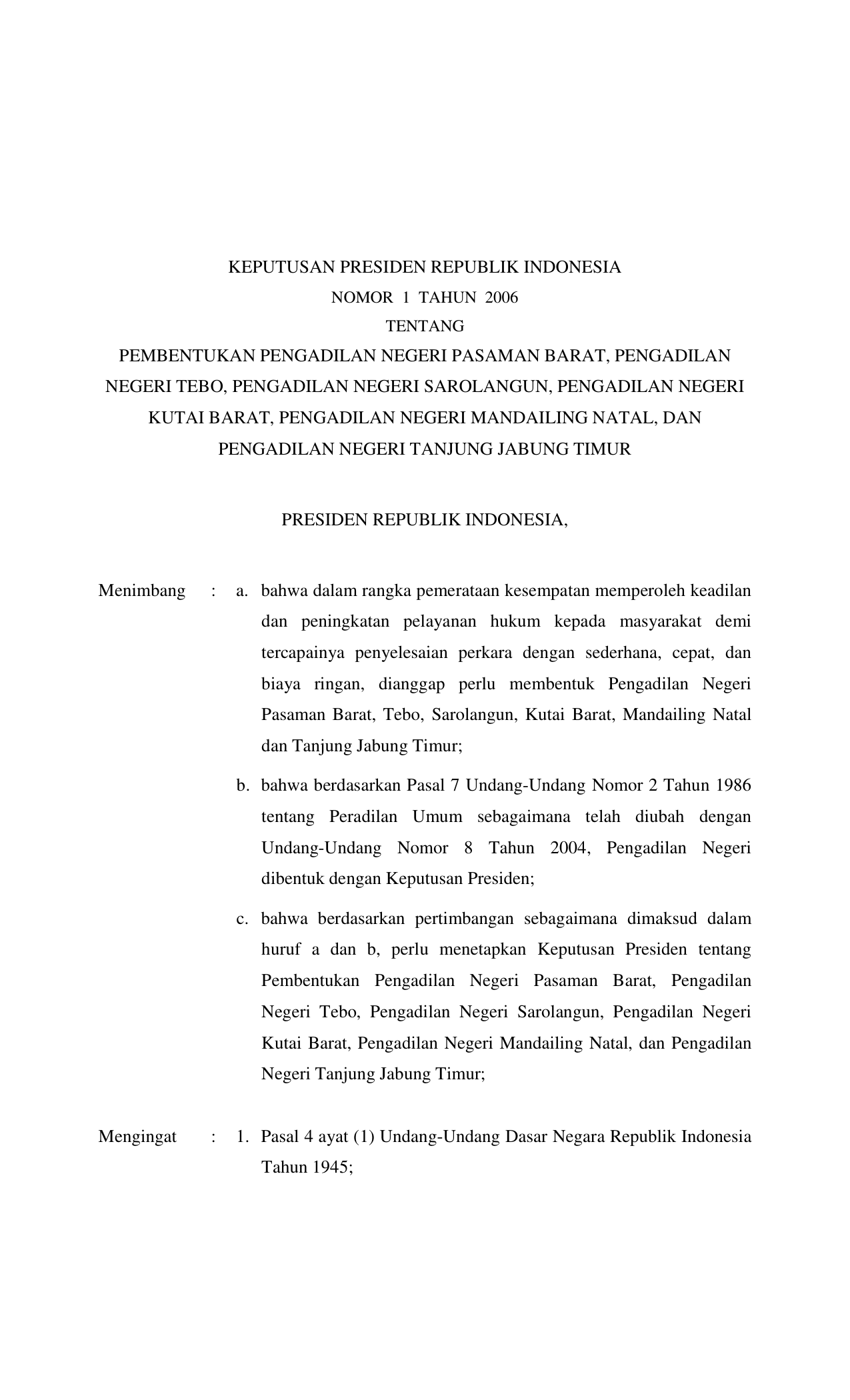 KEPPRES Nomor 1 Tahun 2006 | Keputusan Presiden Nomor 1 Tahun 2006 tentang PEMBENTUKAN PENGADILAN NEGERI PASAMAN BARAT, PENGADILAN NEGERI TEBO, PENGADILAN NEGERI SAROLANGUN, PENGADILAN NEGERI KUTAI BARAT, PENGADILAN NEGERI MANDAILING NATAL, DAN PENGADILAN NEGERI TANJUNG JABUNG TIMUR