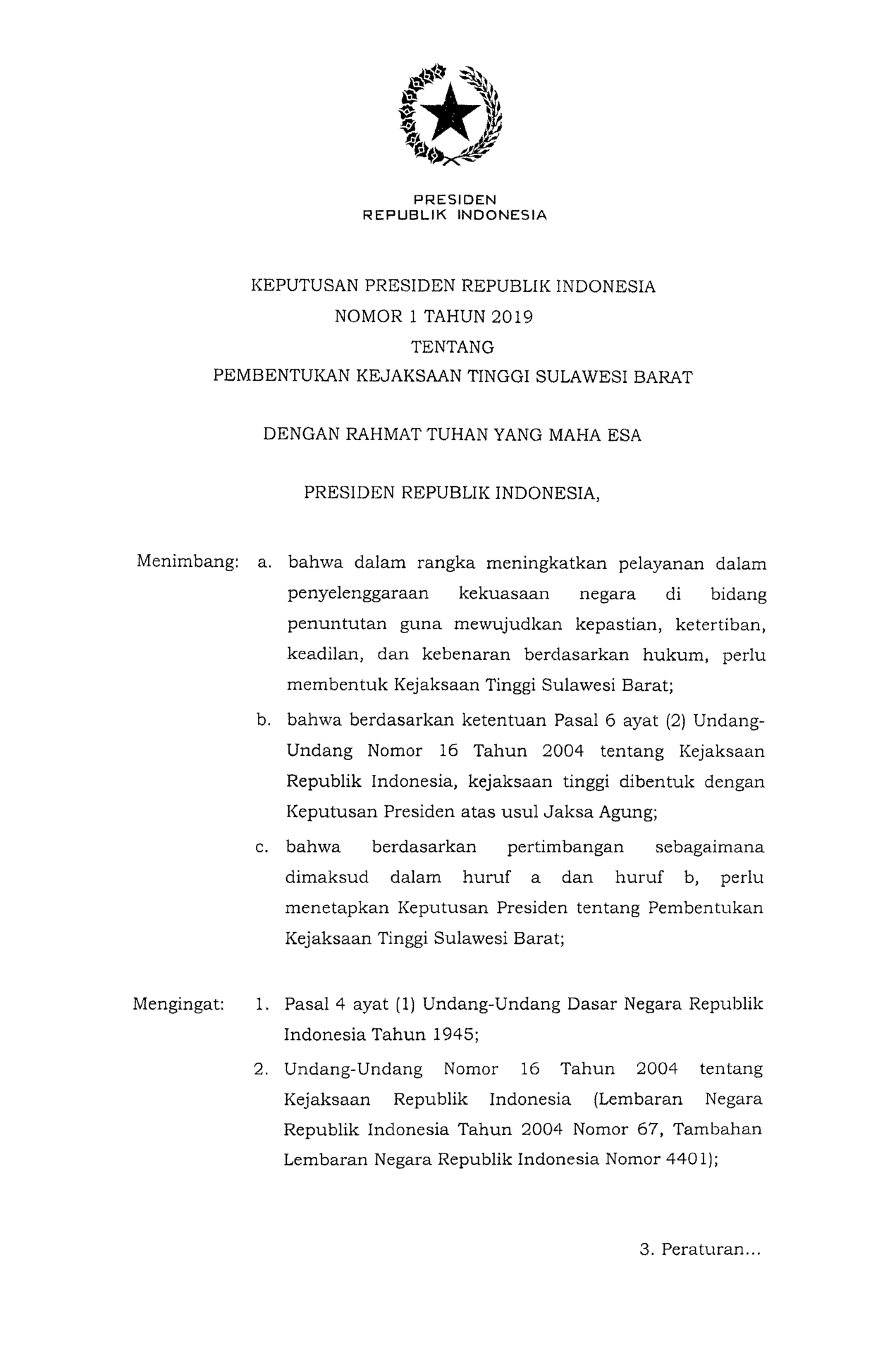 KEPPRES Nomor 1 Tahun 2019 | Keputusan Presiden Nomor 1 Tahun 2019 tentang PEMBENTUKAN KEJAKSAAN TINGGI SULAWESI BARAT