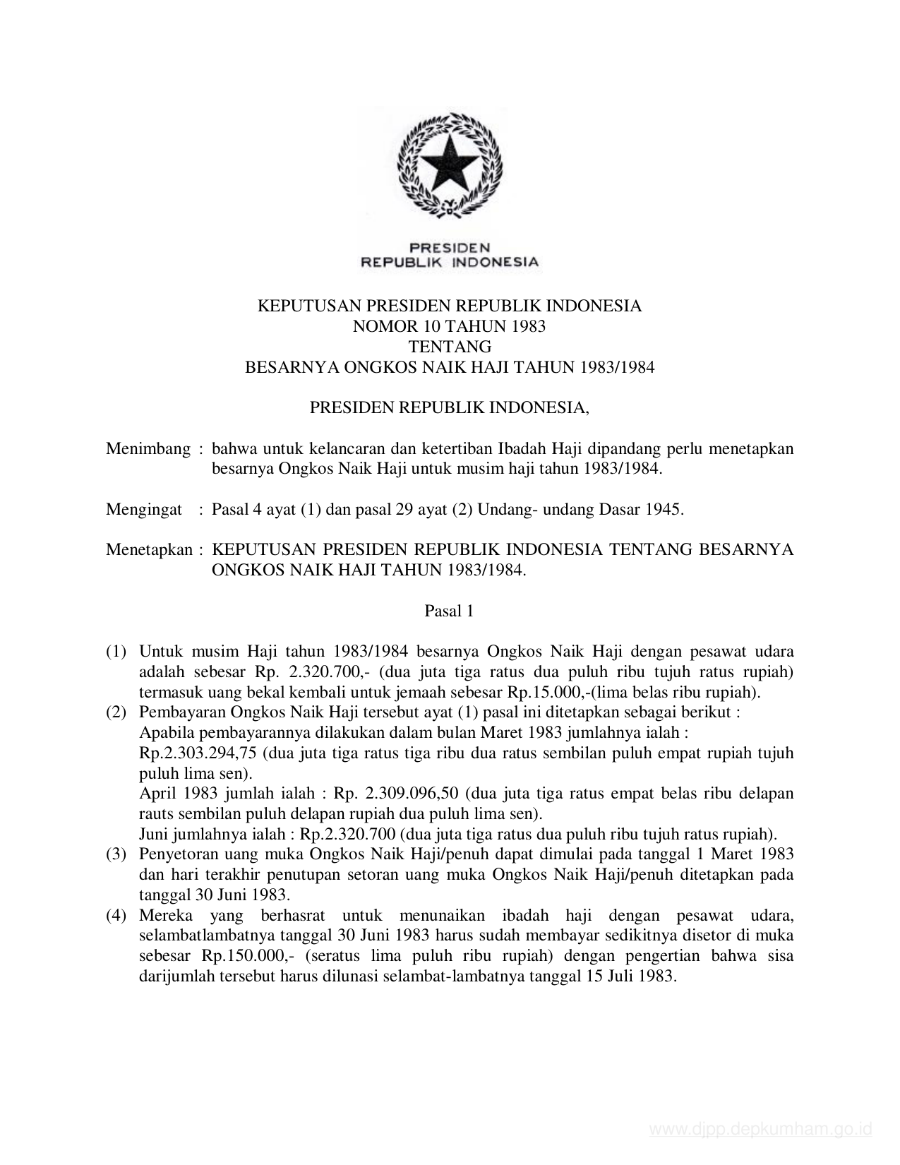 KEPPRES Nomor 10 Tahun 1983 | Keputusan Presiden Nomor 10 Tahun 1983 tentang BESARNYA ONGKOS NAIK HAJI TAHUN 1983/1984
