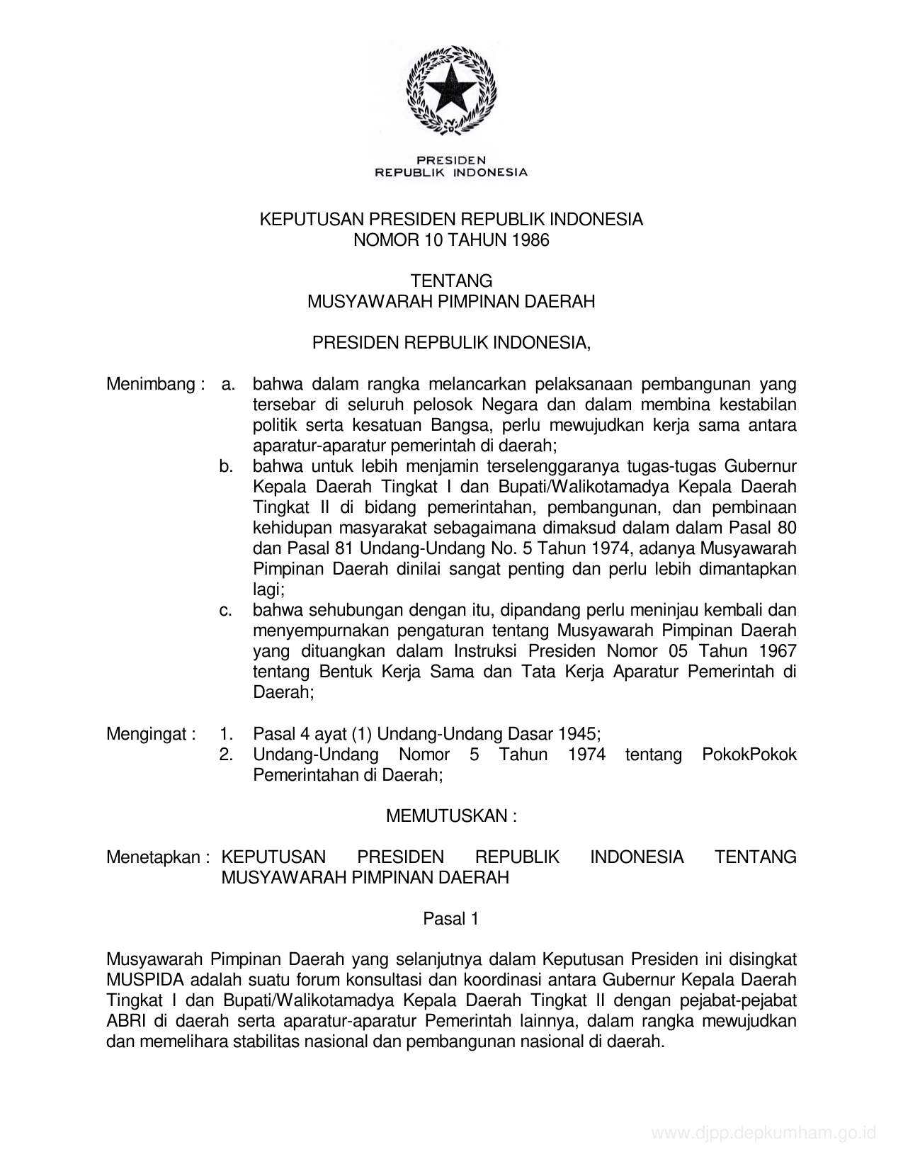 KEPPRES Nomor 10 Tahun 1986 | Keputusan Presiden Nomor 10 Tahun 1986 tentang MUSYAWARAH PIMPINAN DAERAH