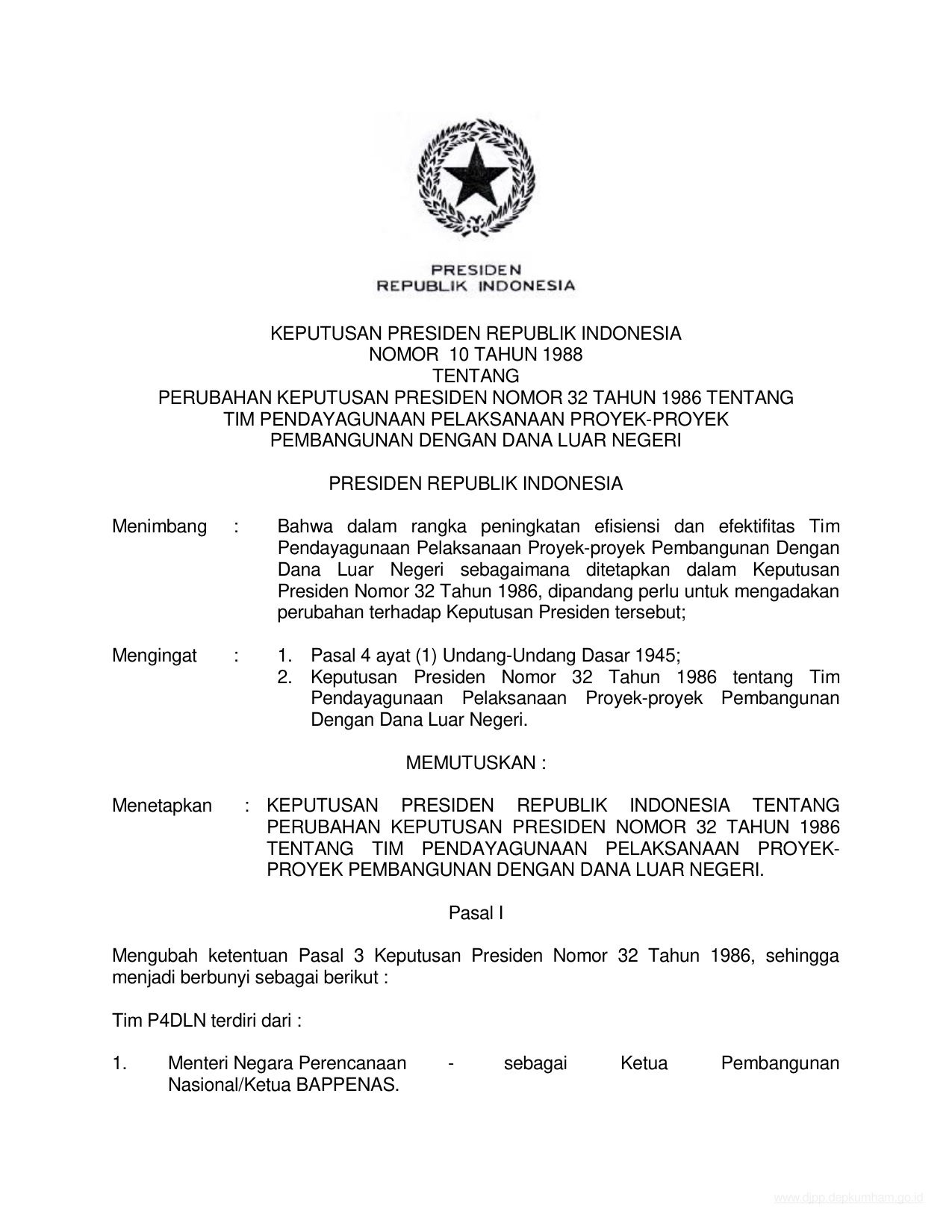 KEPPRES Nomor 10 Tahun 1988 | Keputusan Presiden Nomor 10 Tahun 1988 tentang PERUBAHAN KEPUTUSAN PRESIDEN NOMOR 32 TAHUN 1966 TENTANG TIM PENDAYAGUNAAN PELAKSANAAN PROYEK-PROYEK PEMBANGUNAN DENGAN DANA LUAR NEGERI
