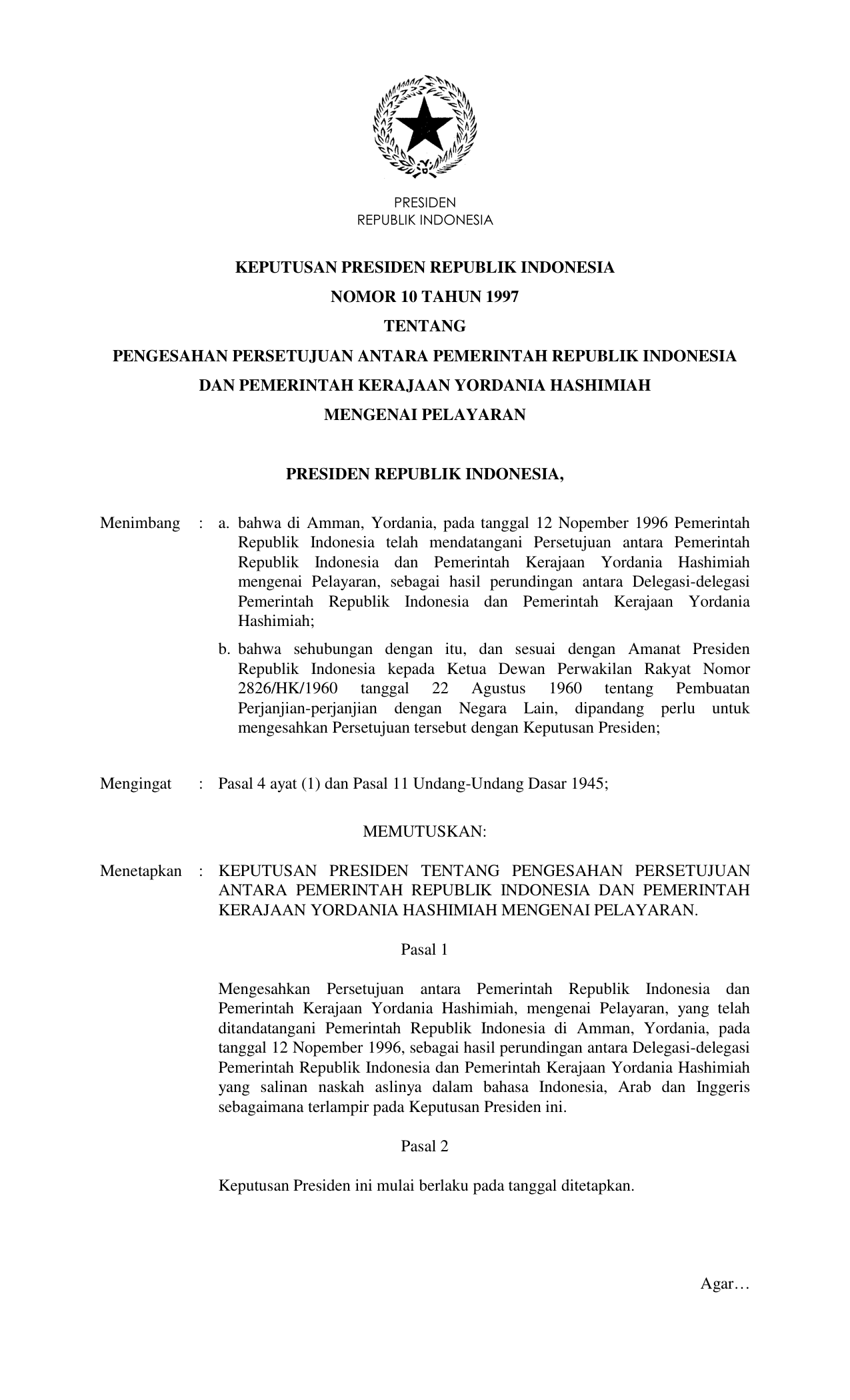 KEPPRES Nomor 10 Tahun 1997 | Keputusan Presiden Nomor 10 Tahun 1997 tentang PENGESAHAN PERSETUJUAN ANTARA PEMERINTAH RI DAN PEMERINTAH KERAJAAN YORDANIA HASHIMIAH MENGENAI PELAYARAN