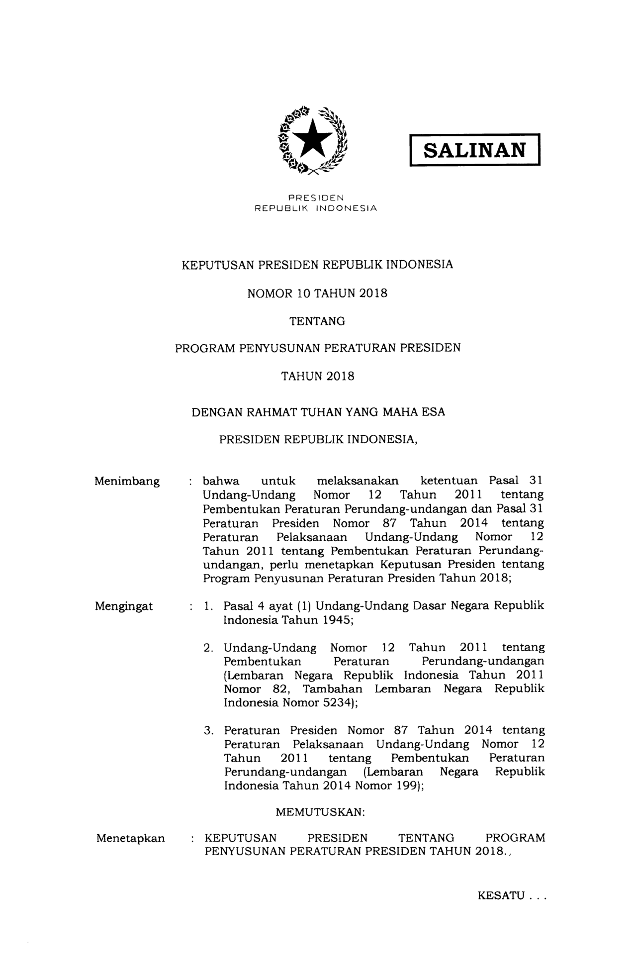KEPPRES Nomor 10 Tahun 2018 | Keputusan Presiden Nomor 10 Tahun 2018 tentang PROGRAM PENYUSUNAN PERATURAN PRESIDEN TAHUN 2018