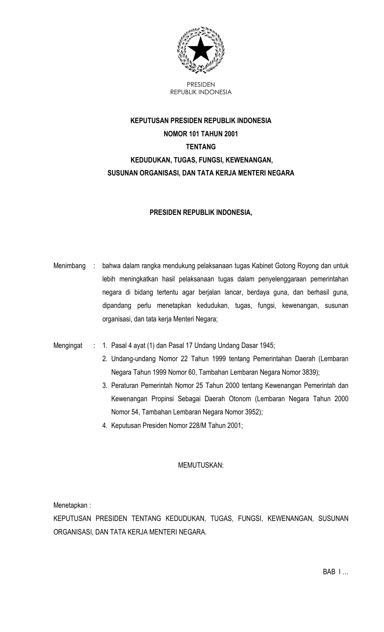 KEPPRES Nomor 101 Tahun 2001 | Keputusan Presiden Nomor 101 Tahun 2001 tentang KEDUDUKAN, TUGAS, FUNGSI, KEWENANGAN, SUSUNAN ORGANISASI DAN TATA KERJA MENTERI NEGARA
