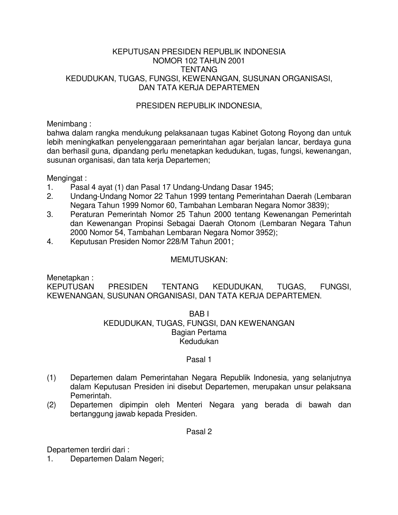 KEPPRES Nomor 102 Tahun 2001 | Keputusan Presiden Nomor 102 Tahun 2001 tentang KEDUDUKAN, TUGAS, FUNGSI, KEWENANGAN, SUSUNAN ORGANISASI DAN TATA KERJA DEPARTEMEN