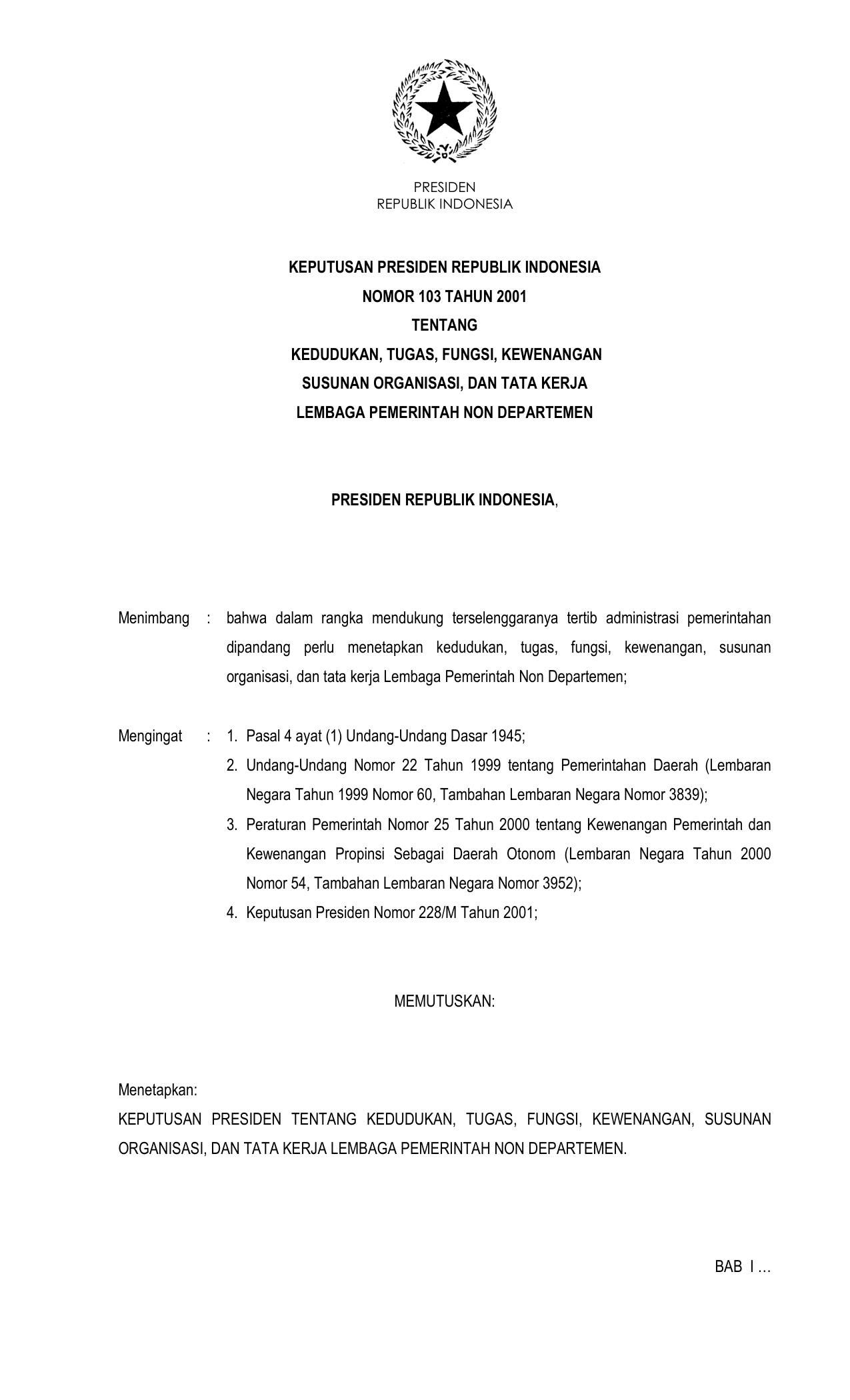 KEPPRES Nomor 103 Tahun 2001 | Keputusan Presiden Nomor 103 Tahun 2001 tentang KEDUDUKAN, TUGAS, FUNGSI, KEWENANGAN, SUSUNAN ORGANISASI DAN TATA KERJA LEMBAGA PEMERINTAH NON DEPARTEMEN