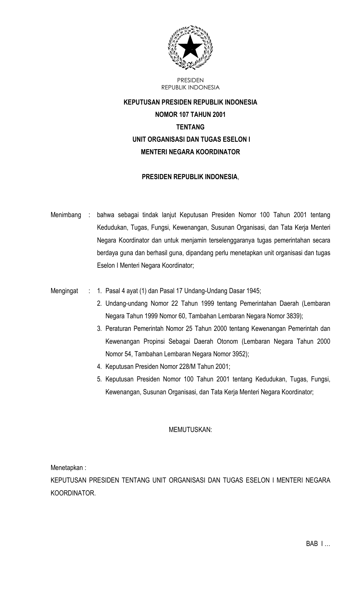 KEPPRES Nomor 107 Tahun 2001 | Keputusan Presiden Nomor 107 Tahun 2001 tentang UNIT ORGANISASI DAN TUGAS ESELON I MENTERI NEGARA KOORDINATOR
