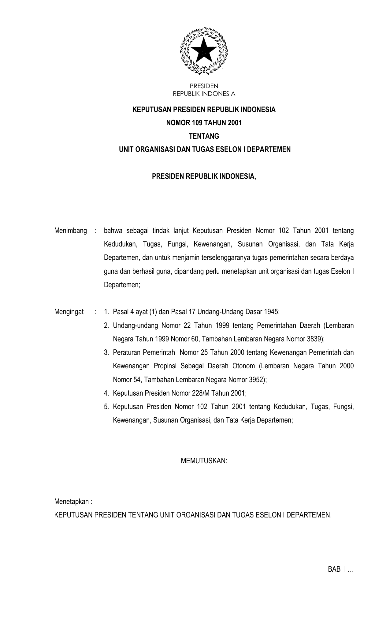 KEPPRES Nomor 109 Tahun 2001 | Keputusan Presiden Nomor 109 Tahun 2001 tentang UNIT ORGANISASI DAN TUGAS ESELON I DEPARTEMEN
