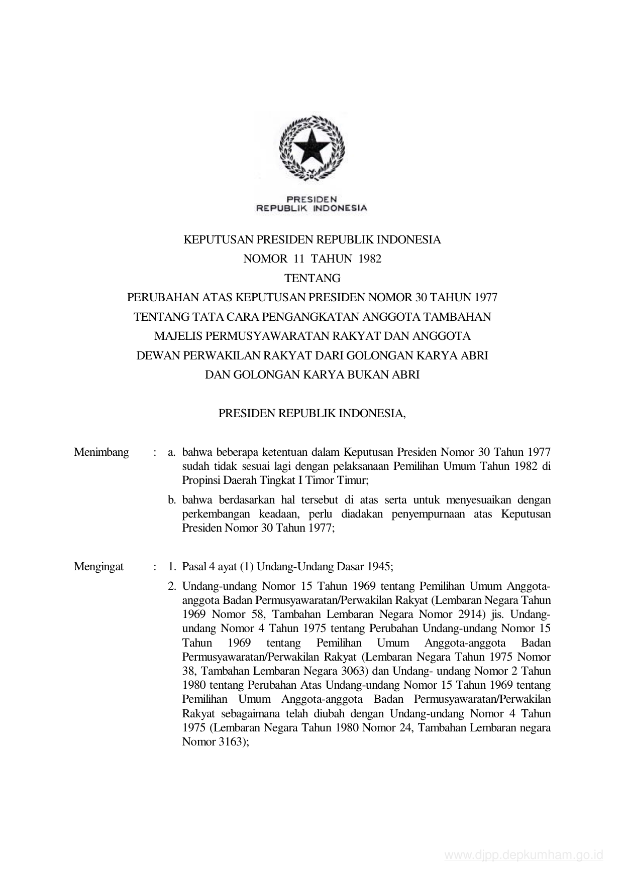 KEPPRES Nomor 11 Tahun 1982 | Keputusan Presiden Nomor 11 Tahun 1982 tentang PERUBAHAN ATAS KEPUTUSAN PRESIDEN NOMOR 30 TAHUN 1977 TENTANG TATA CARA PENGANGKATAN ANGGOTA TAMBAHAN MAJELIS PERMUSYAWARATAN RAKYAT DAN ANGGOTA DEWAN PERWAKILAN RAKYAT DARI GOLONGAN KARYA, ANGKATAN BERSENJATA REPUBLIK INDONESIA DAN GOLONGAN KARYA BUKAN ABRI