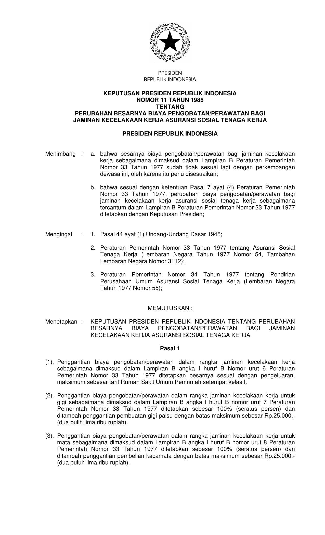 KEPPRES Nomor 11 Tahun 1985 | Keputusan Presiden Nomor 11 Tahun 1985 tentang PERUBAHAN BESARNYA BIAYA PENGOBATAN/PERAWATAN BAGI JAMINAN KECELAKAAN KERJA ASURANSI SOSIAL TENAGA KERJA