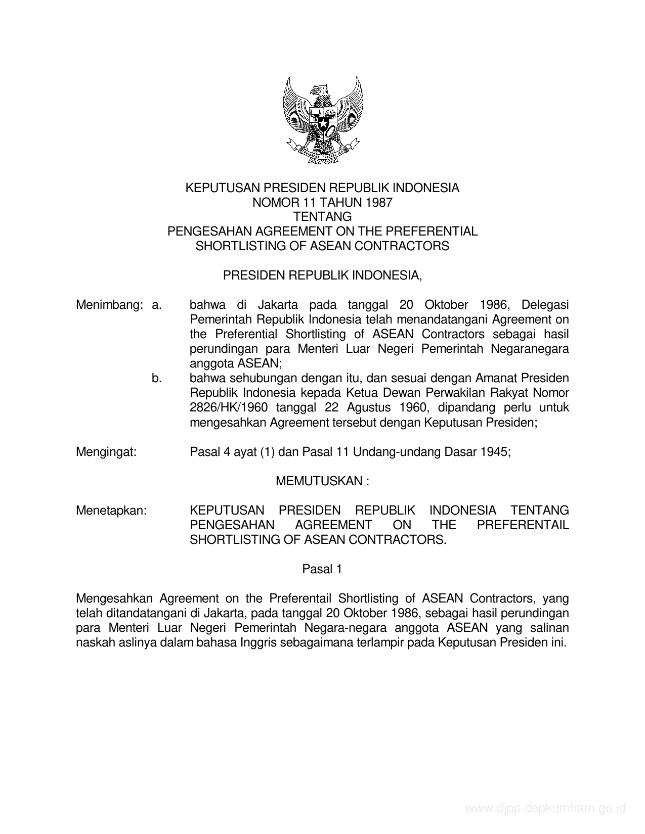 KEPPRES Nomor 11 Tahun 1987 | Keputusan Presiden Nomor 11 Tahun 1987 tentang PENGESAHAN AGREEMENT ON THE PREFERENTIAL SHORTLISTING OF ASEAN CONTRACTORS