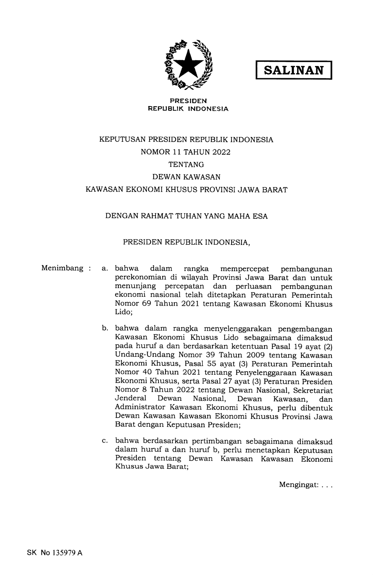 KEPPRES Nomor 11 Tahun 2022 | Keputusan Presiden Nomor 11 Tahun 2022 tentang DEWAN KAWASAN KAWASAN EKONOMI KHUSUS PROVINSI JAWA BARAT
