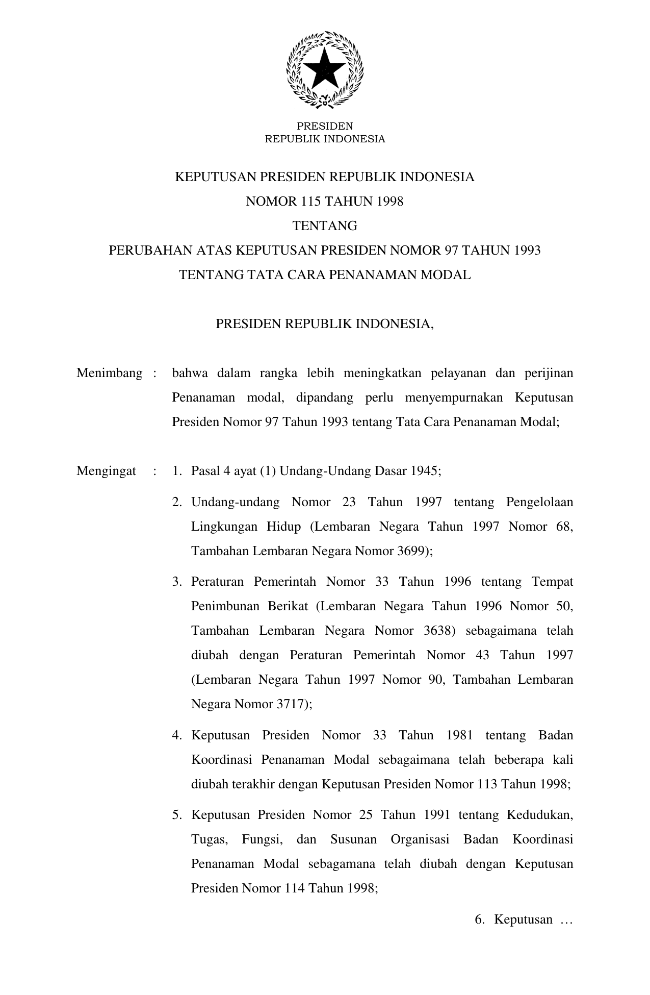 KEPPRES Nomor 115 Tahun 1998 | Keputusan Presiden Nomor 115 Tahun 1998 tentang PERUBAHAN ATAS KEPUTUSAN PRESIDEN NOMOR 97 TAHUN 1993 TENTANG TATA CARA PENANAMAN MODAL