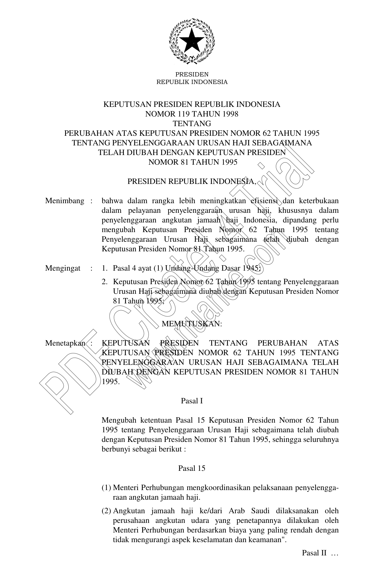 KEPPRES Nomor 119 Tahun 1998 | Keputusan Presiden Nomor 119 Tahun 1998 tentang PERUBAHAN ATAS KEPUTUSAN PRESIDEN NOMOR 62 TAHUN 1995 TENTANG PENYELENGGARAAN URUSAN HAJI SEBAGAIMANA TELAH DIUBAH DENGAN KEPUTUSAN PRESIDEN NOMOR 81 TAHUN 1995