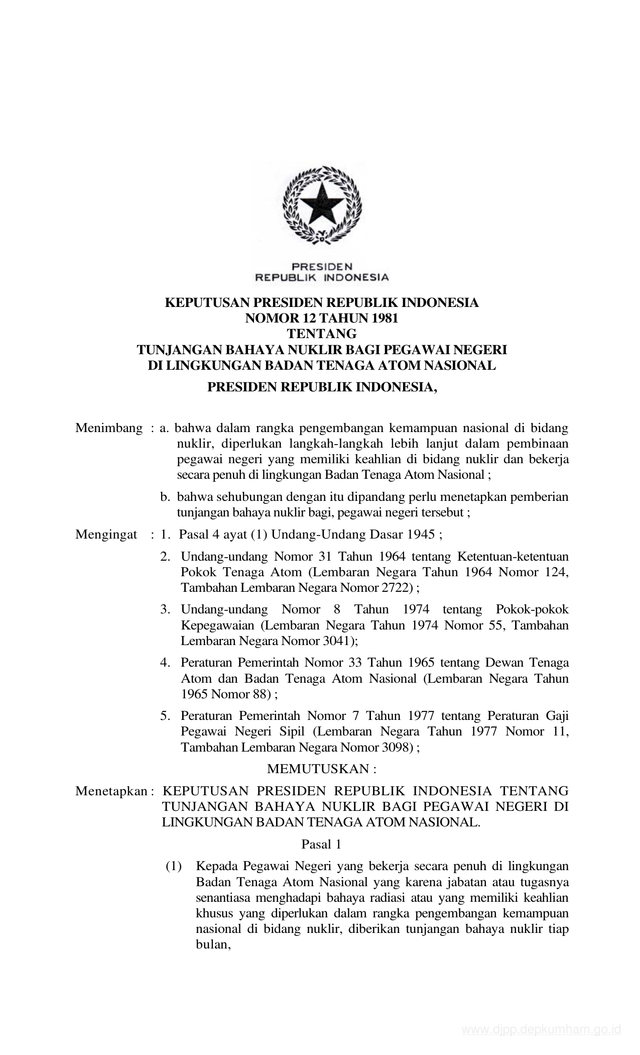 KEPPRES Nomor 12 Tahun 1981 | Keputusan Presiden Nomor 12 Tahun 1981 tentang TUNJANGAN BAHAYA NUKLIR BAGI PEGAWAI NEGERI SIPIL DI LINGKUNGAN BADAN TENAGA ATOM NASIONAL