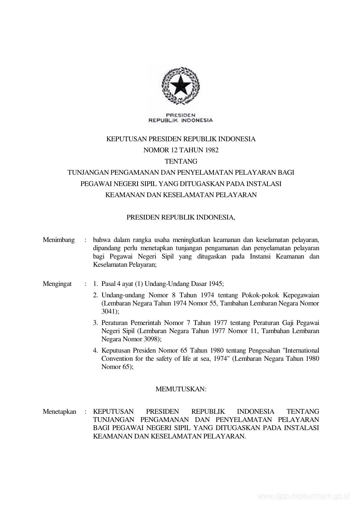 KEPPRES Nomor 12 Tahun 1982 | Keputusan Presiden Nomor 12 Tahun 1982 tentang TUNJANGAN PENGAMANAN DAN PENYELAMATAN PELAYARAN BAGI PEGAWAI NEGERI SIPIL YANG DITUGASKAN PADA INSTALASI KEAMANAN DAN KESELAMATAN PELAYARAN