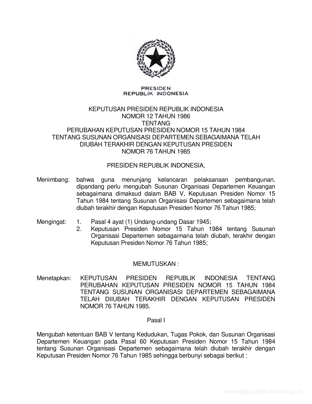 KEPPRES Nomor 12 Tahun 1986 | Keputusan Presiden Nomor 12 Tahun 1986 tentang PERUBAHAN KEPUTUSAN PRESIDEN NOMOR 15 TAHUN 1984 TENTANG SUSUNAN ORGANISASI DEPARTEMEN SEBAGAIMANA TELAH DIUBAH TERAKHIR DENGAN KEPUTUSAN PRESIDEN NOMOR 76 TAHUN 1985