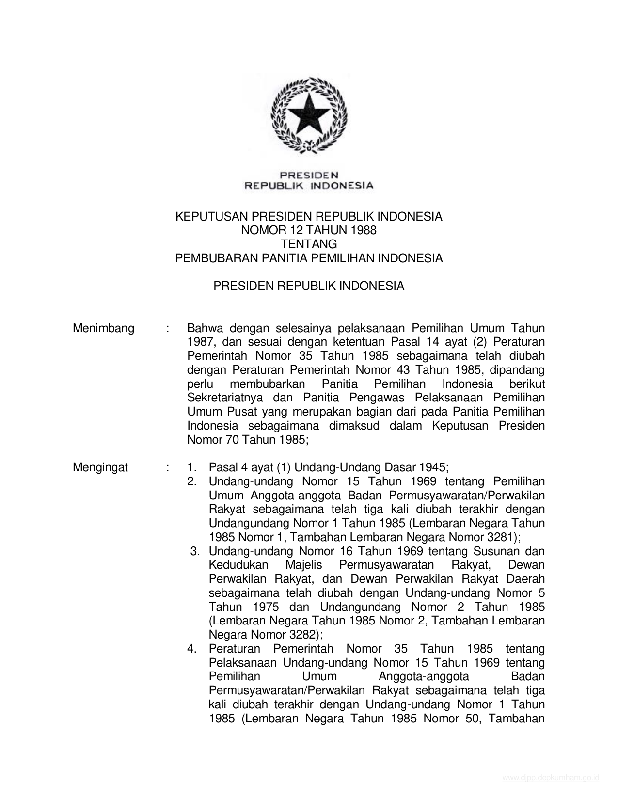 KEPPRES Nomor 12 Tahun 1988 | Keputusan Presiden Nomor 12 Tahun 1988 tentang PEMBUBARAN PANITIA PEMILIHAN INDONESIA