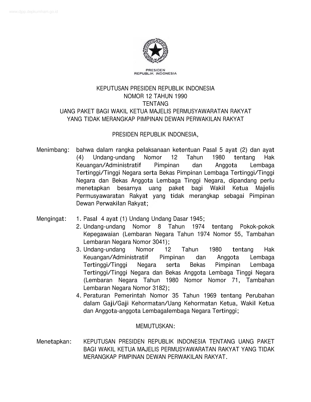 KEPPRES Nomor 12 Tahun 1990 | Keputusan Presiden Nomor 12 Tahun 1990 tentang UANG PAKET BAGI WAKIL KETUA MAJELIS PERMUSYAWARATAN RAKYAT YANG TIDAK MERANGKAP PIMPINAN DEWAN PERWAKILAN RAKYAT