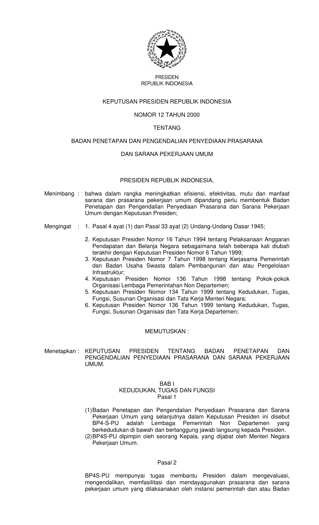KEPPRES Nomor 12 Tahun 2000 | Keputusan Presiden Nomor 12 Tahun 2000 tentang BADAN PENETAPAN DAN PENGENDALIAN PENYEDIAAN PRASARANA DAN SARANA PEKERJAAN UMUM