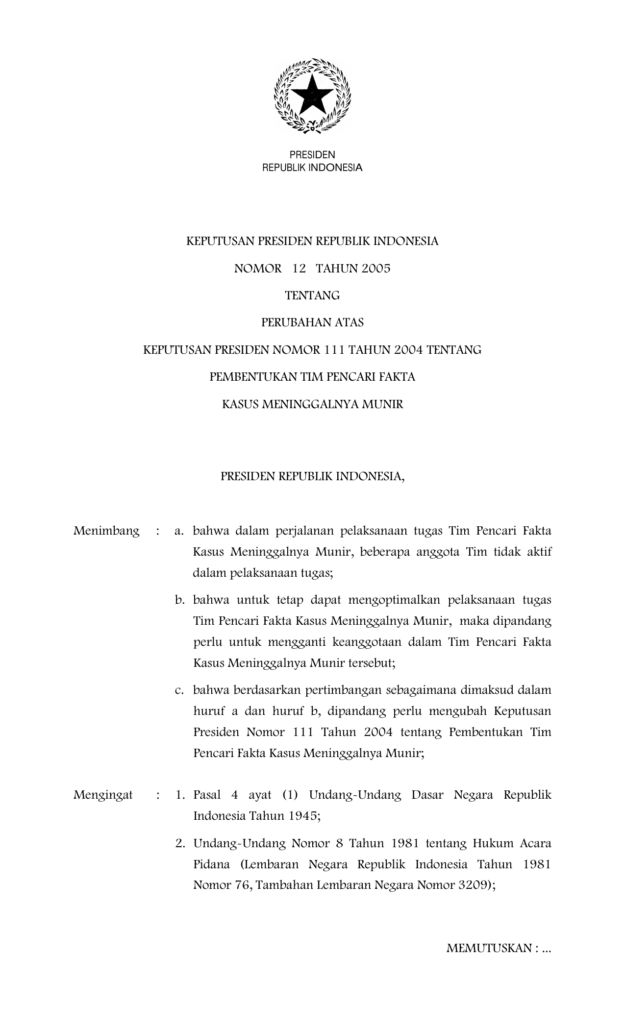 KEPPRES Nomor 12 Tahun 2005 | Keputusan Presiden Nomor 12 Tahun 2005 tentang PERUBAHAN KEPPRES 111-2004 TENTANG PEMBENTUKAN TIM PENCARI FAKTA KASUS MENINGGALNYA MUNIR