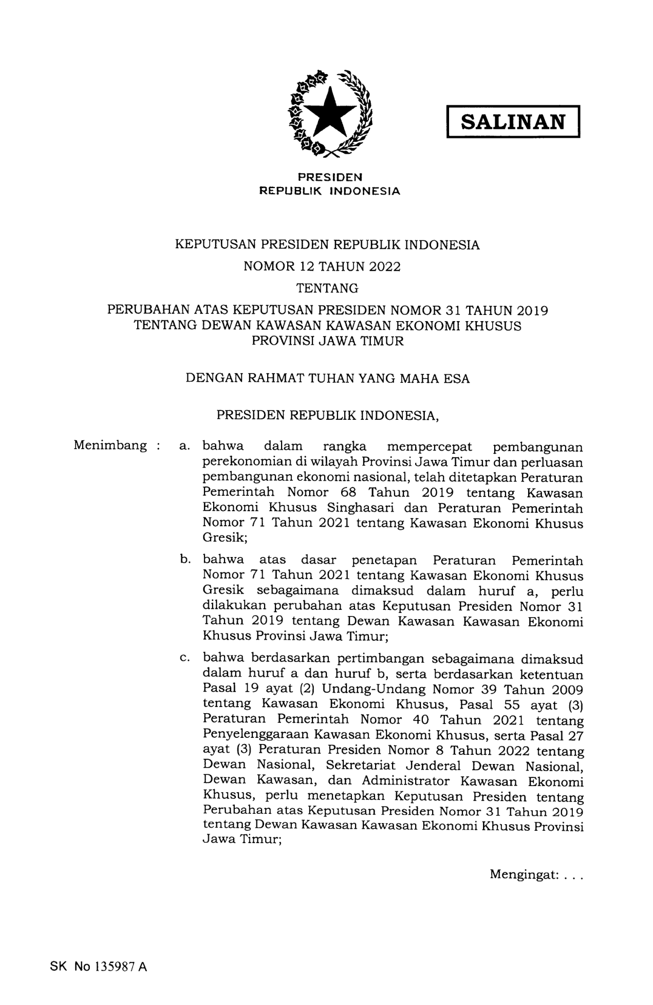 KEPPRES Nomor 12 Tahun 2022 | Keputusan Presiden Nomor 12 Tahun 2022 tentang PERUBAHAN ATAS KEPUTUSAN PRESIDEN NOMOR 31 TAHUN 2019 TENTANG DEWAN KAWASAN KAWASAN EKONOMI KHUSUS PROVINSI JAWA TIMUR