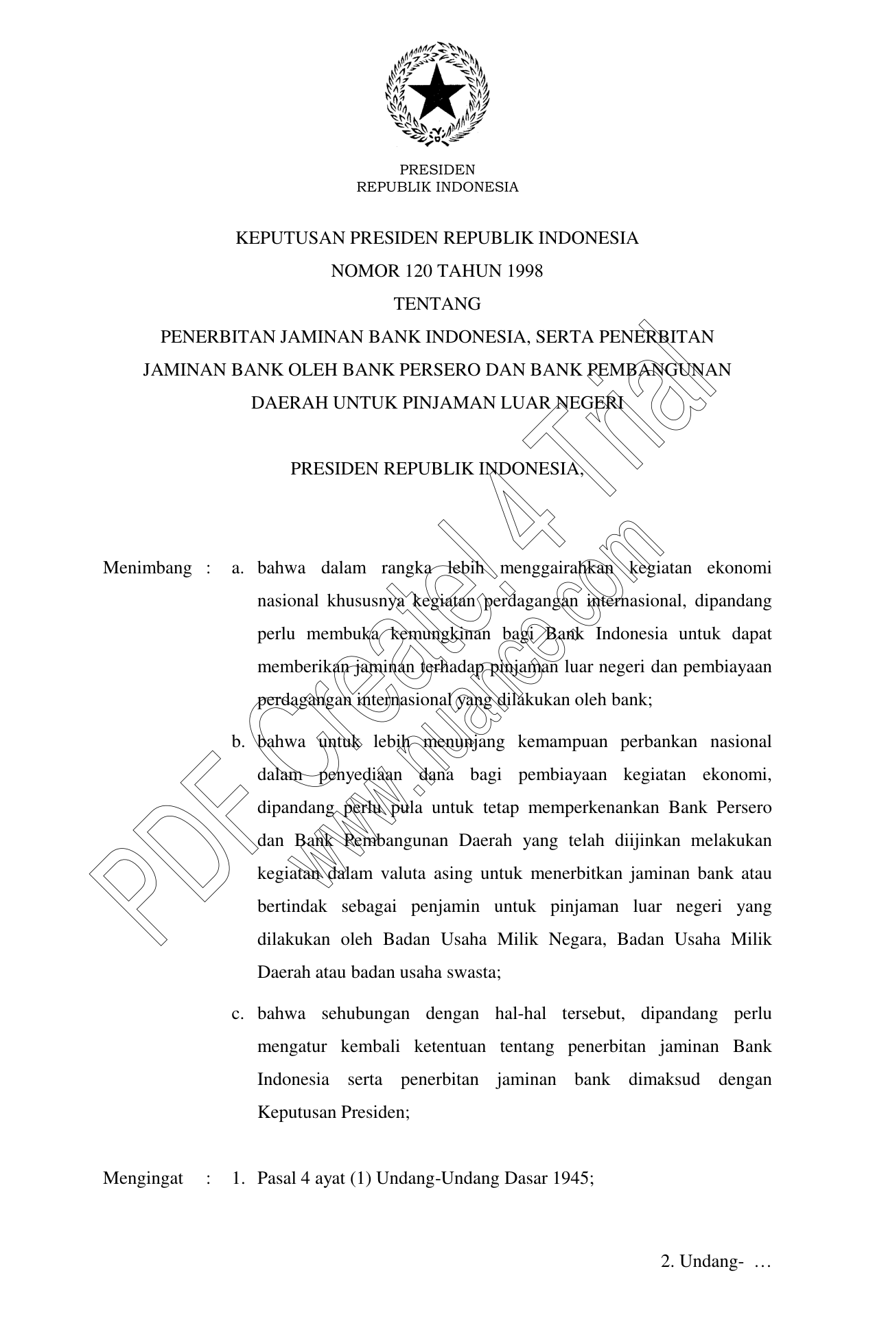 KEPPRES Nomor 120 Tahun 1998 | Keputusan Presiden Nomor 120 Tahun 1998 tentang PENERBITAN JAMINAN BANK INDONESIA, SERTA PENERBITAN JAMINAN BANK OLEH BANK PERSERO DAN BANK PEMBANGUNAN DAERAH UNTUK PINJAMAN LUAR NEGERI
