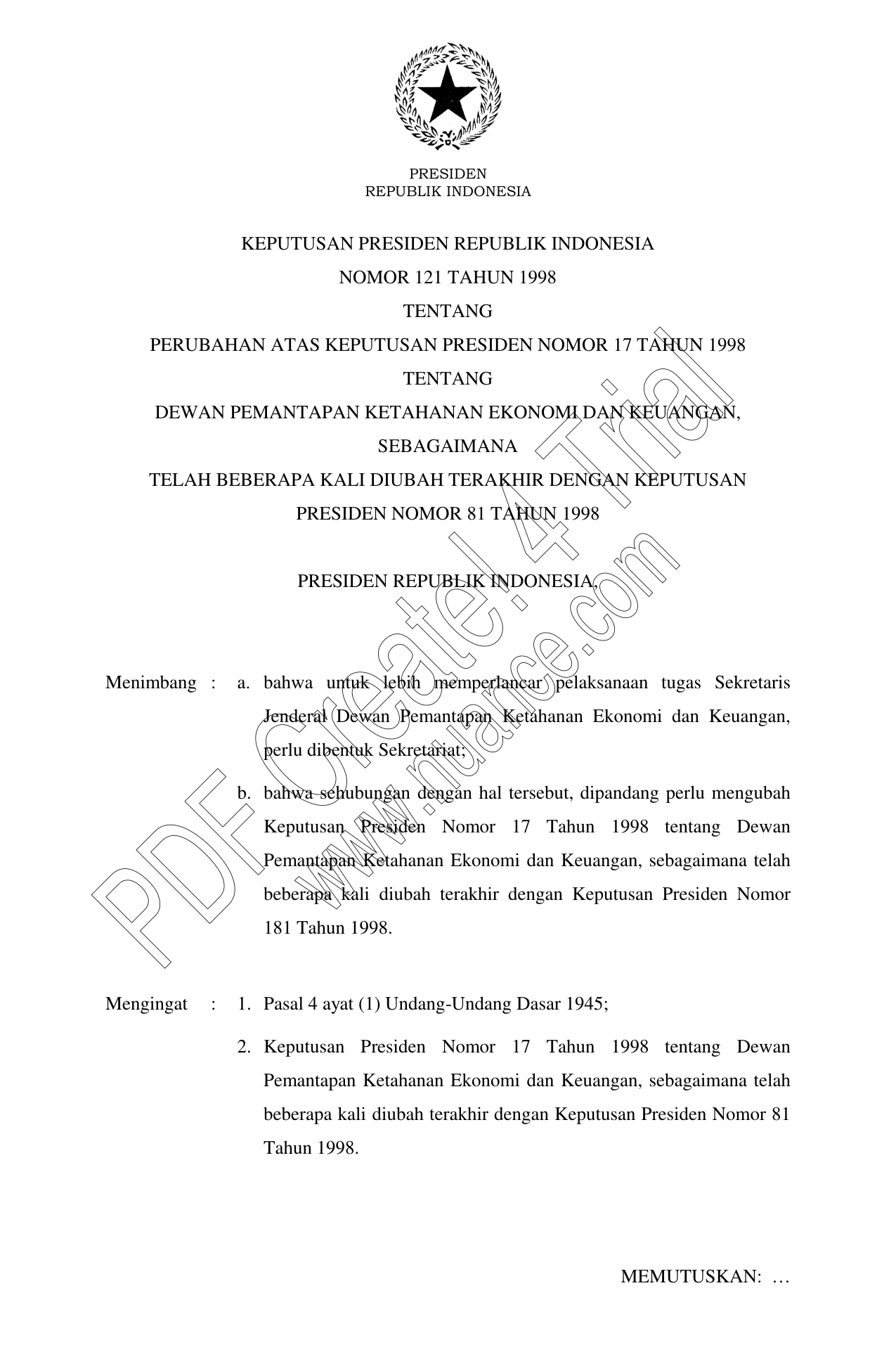 KEPPRES Nomor 121 Tahun 1998 | Keputusan Presiden Nomor 121 Tahun 1998 tentang PERUBAHAN ATAS KEPUTUSAN PRESIDEN NOMOR 17 TAHUN 1998 TENTANG DEWAN PEMANTAPAN KETAHANAN EKONOMI DAN KEUANGAN, SEBAGAIMANA TELAH BEBERAPA KALI DIUBAH TERAKHIR DENGAN KEPUTUSAN PRESIDEN NOMOR 81 TAHUN 1998