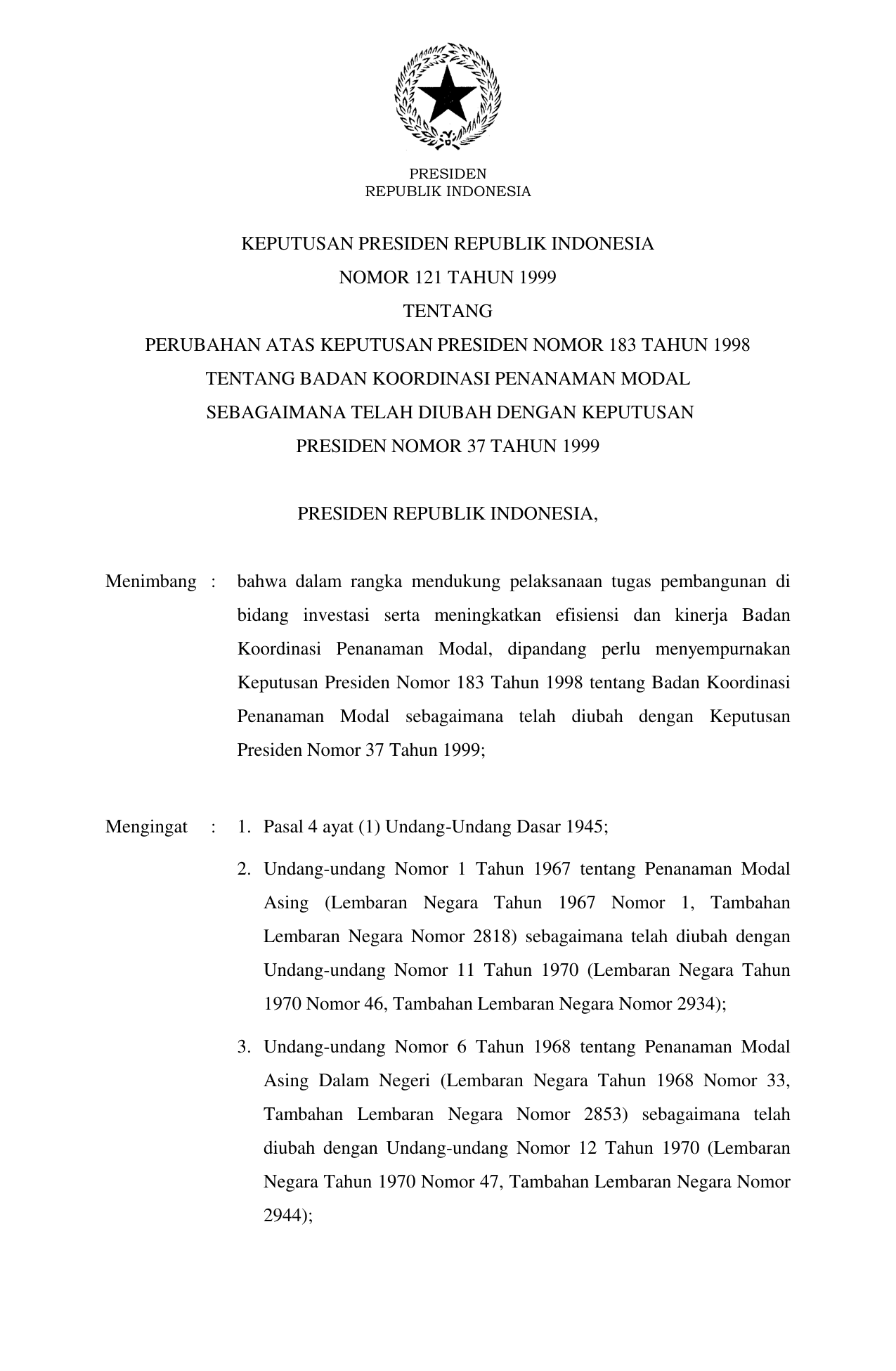 KEPPRES Nomor 121 Tahun 1999 | Keputusan Presiden Nomor 121 Tahun 1999 tentang PERUBAHAN KEPPRES 183-1998 TENTANG BADAN KOORDINASI PENANAMAN MODAL SEBAGAIMANA TELAH DIUBAH DENGAN KEPPRES 37-1999