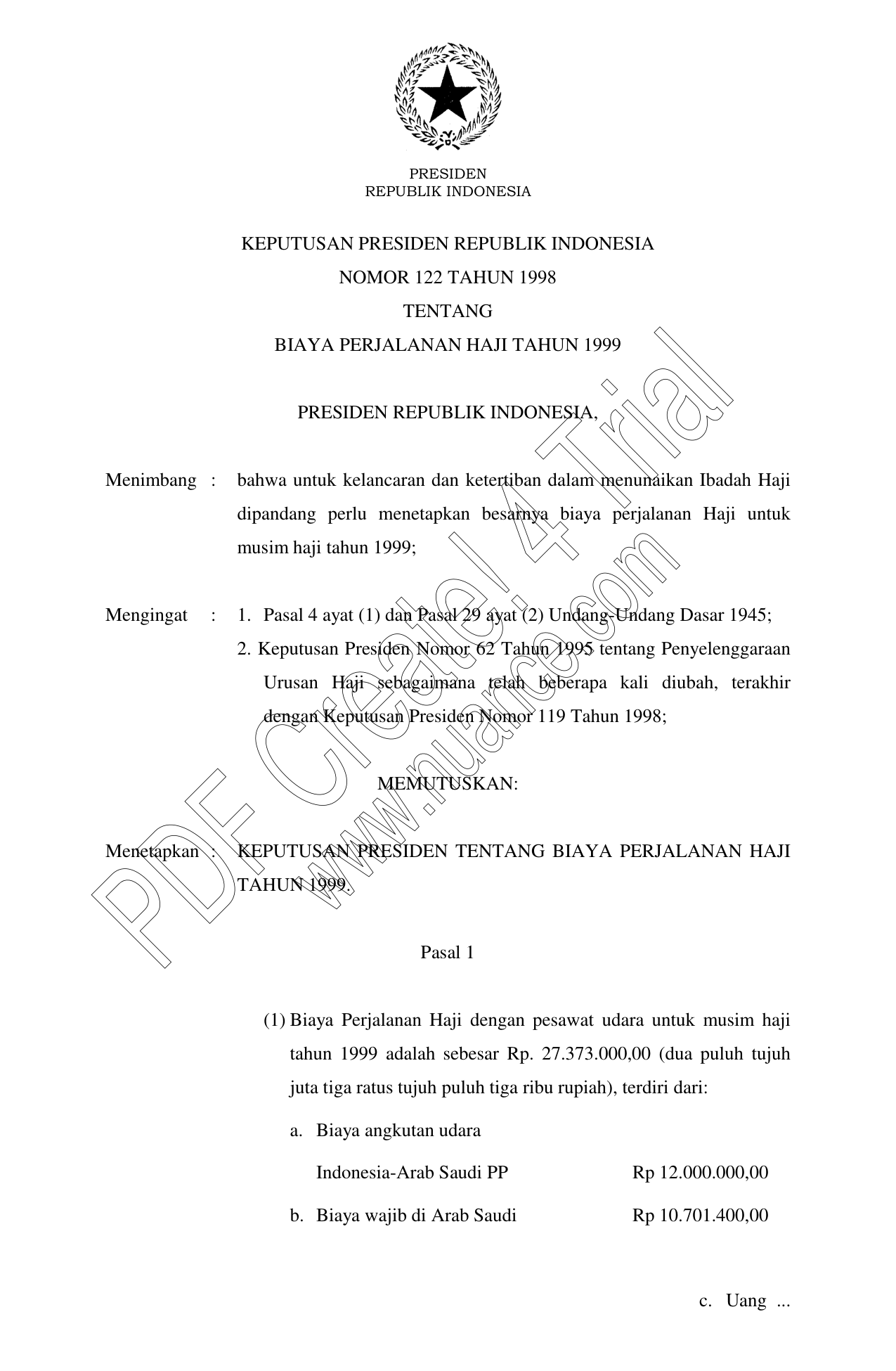 KEPPRES Nomor 122 Tahun 1998 | Keputusan Presiden Nomor 122 Tahun 1998 tentang BIAYA PERJALANAN HAJI TAHUN 1999