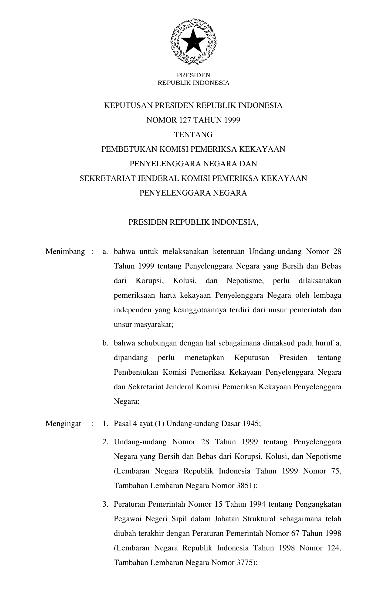 KEPPRES Nomor 127 Tahun 1999 | Keputusan Presiden Nomor 127 Tahun 1999 tentang PEMBENTUKAN KOMISI PEMERIKSA KEKAYAAN PENYELENGGARA NEGARA DAN SEKRETARIAT JENDERAL KOMISI PEMERIKSA KEKAYAAN PENYELENGGARA NEGARA
