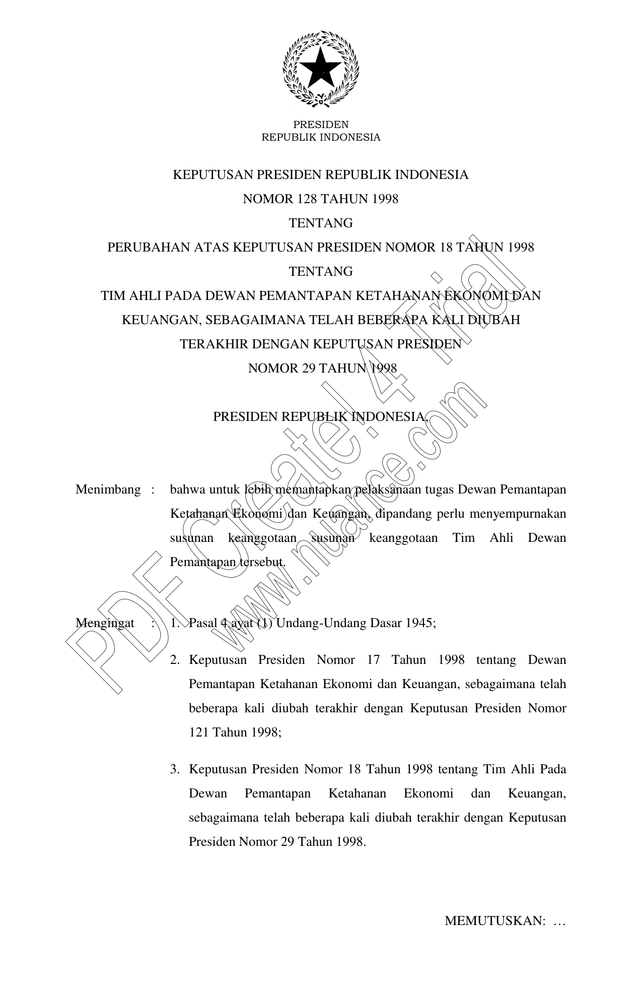 KEPPRES Nomor 128 Tahun 1998 | Keputusan Presiden Nomor 128 Tahun 1998 tentang PERUBAHAN ATAS KEPUTUSAN PRESIDEN NOMOR 18 TAHUN 1998 TENTANG TIM AHLI PADA DEWAN PEMANTAPAN KETAHANAN EKONOMI DAN KEUANGAN, SEBAGAIMANA TELAH BEBERAPA KALI DIUBAH TERAKHIR DENGAN KEPUTUSAN PRESIDEN NOMOR 29 TAHUN 1998