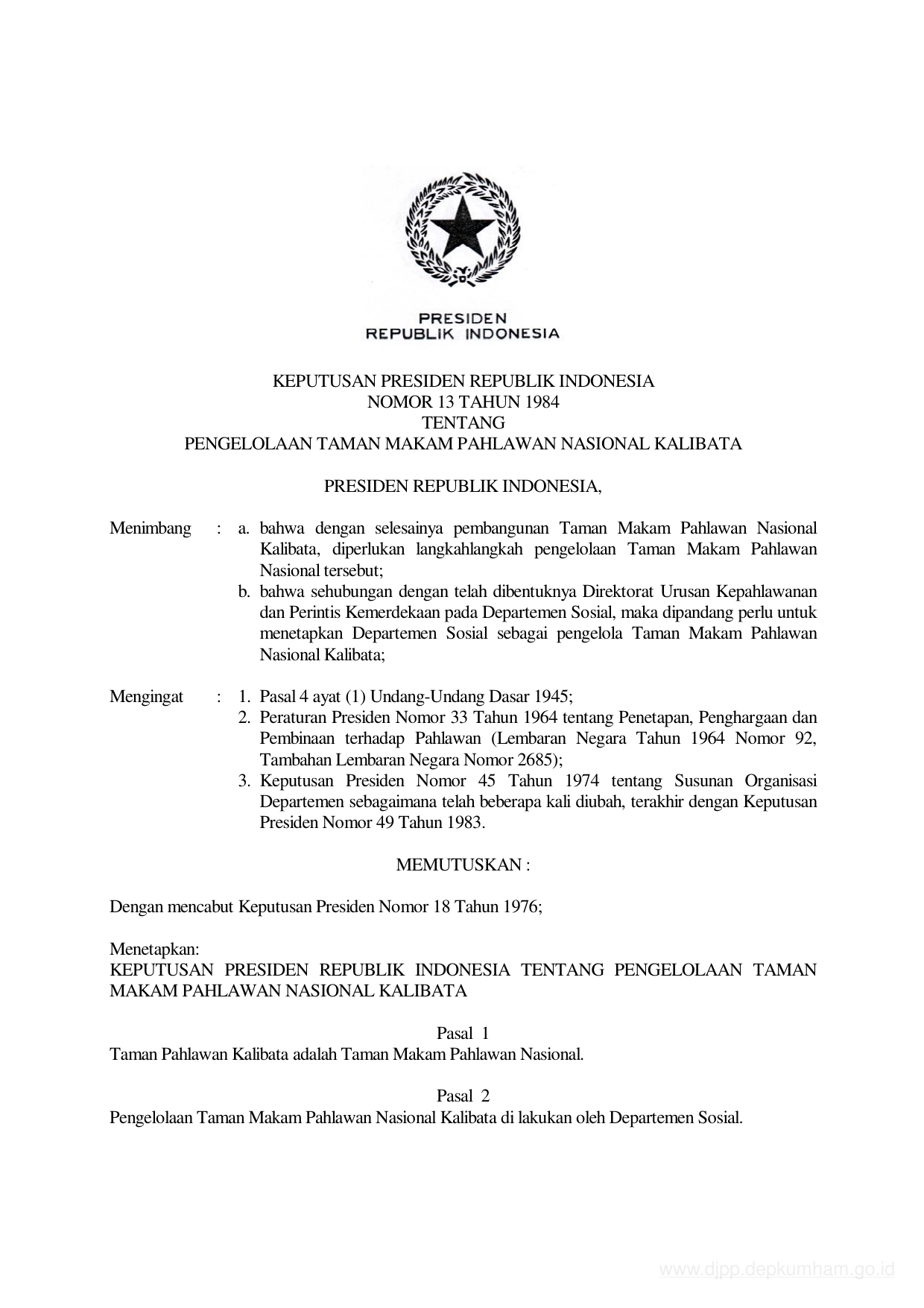 KEPPRES Nomor 13 Tahun 1984 | Keputusan Presiden Nomor 13 Tahun 1984 tentang PENGELOLAAN TAMAN MAKAM PAHLAWAN KALIBATA