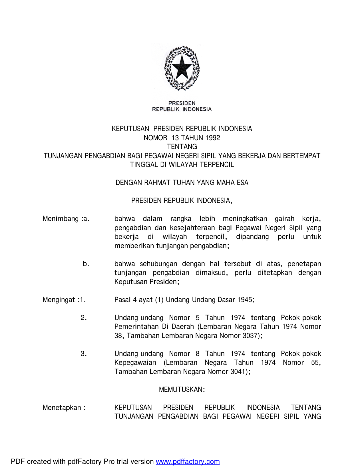 KEPPRES Nomor 13 Tahun 1992 | Keputusan Presiden Nomor 13 Tahun 1992 tentang TUNJANGAN PENGABDIAN BAGI PEGAWAI NEGERI SIPIL YANG BEKERJA DAN BERTEMPAT TINGGAL DI WILAYAH TERPENCIL