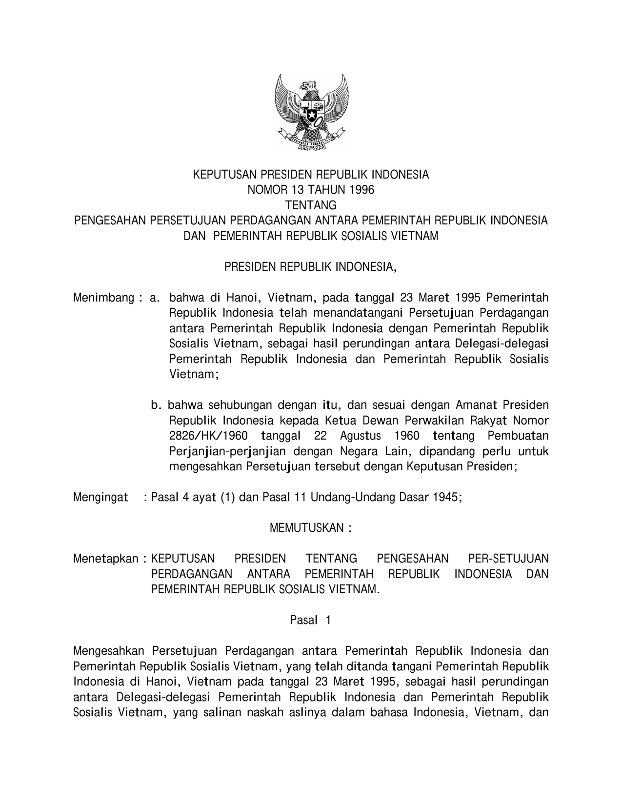 KEPPRES Nomor 13 Tahun 1996 | Keputusan Presiden Nomor 13 Tahun 1996 tentang PENGESAHAN PERSERTUJUAN PERDAGANGAN ANTARA PEMERINTAH RI DAN PEMERINTAH REPUBLIK SOSIALIS VIETNAM
