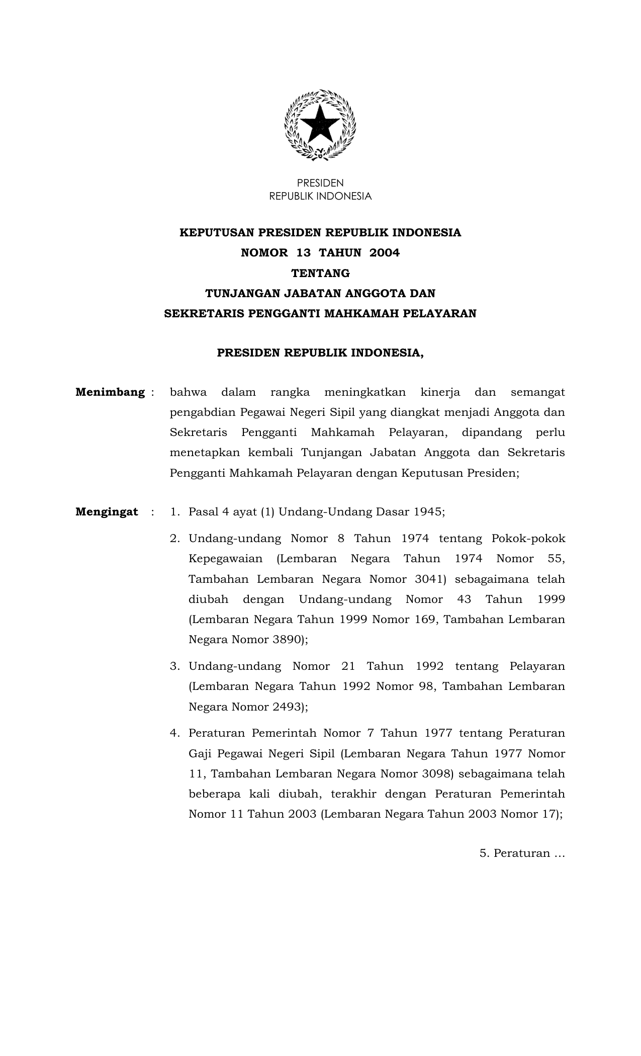 KEPPRES Nomor 13 Tahun 2004 | Keputusan Presiden Nomor 13 Tahun 2004 tentang TUNJANGAN JABATAN ANGGOTA DAN SEKRETARIS PENGGANTI MAHKAMAH PELAYARAN