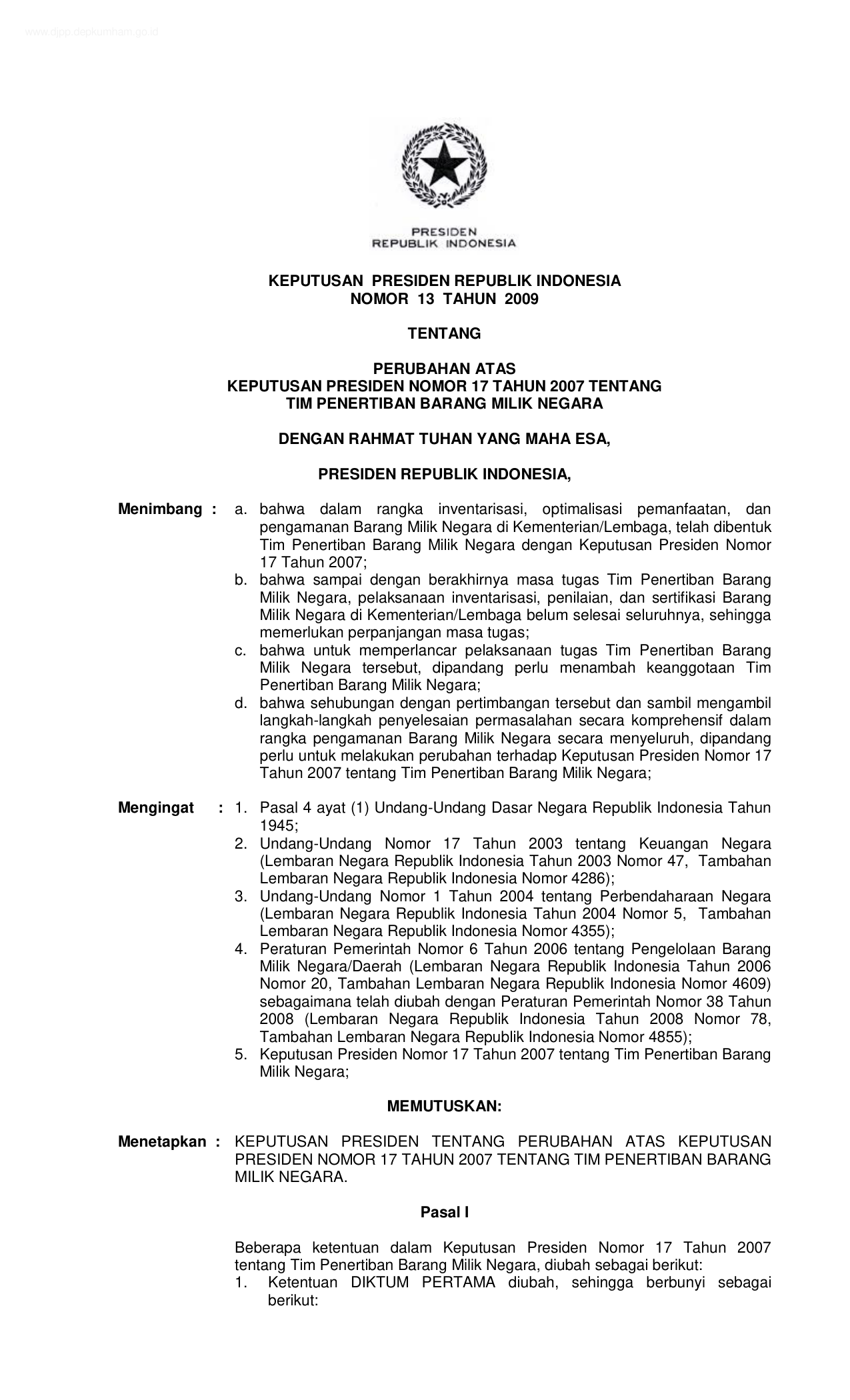 KEPPRES Nomor 13 Tahun 2009 | Keputusan Presiden Nomor 13 Tahun 2009 tentang PERUBAHAN KEPPRES 17-2007 TENTANG TIM PENERTIBAN BARANG MILIK NEGARA