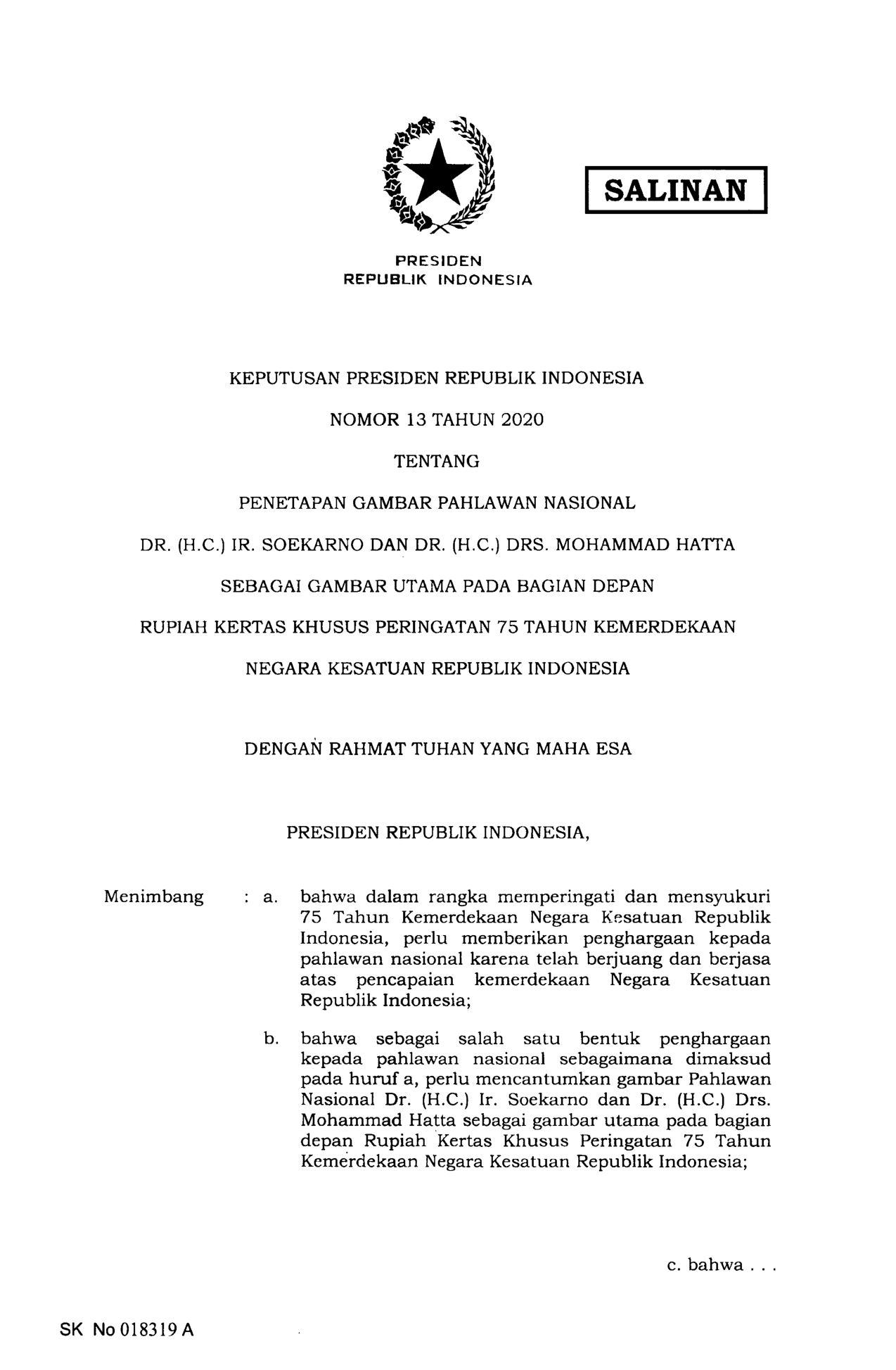 KEPPRES Nomor 13 Tahun 2020 | Keputusan Presiden Nomor 13 Tahun 2020 tentang PENETAPAN GAMBAR PAHLAWAN NASIONALDR. (H.C.) IR. SOEKARNO DAN DR. (H.C.) DRS. MOHAMMAD HATTASEBAGAI GAMBAR UTAMA PADA BAGIAN DEPANRUPIAH KERTAS KHUSUS PERINGATAN 75 TAHUN KEMERDEKAANNEGARA KESATUAN REPUBLIK INDONESIA