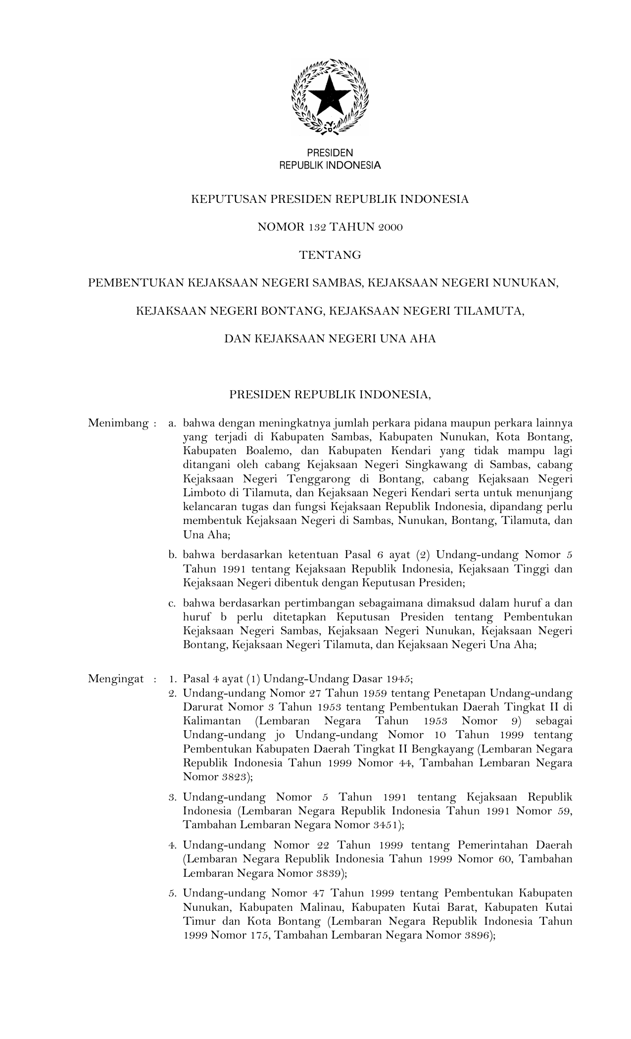 KEPPRES Nomor 132 Tahun 2000 | Keputusan Presiden Nomor 132 Tahun 2000 tentang PEMBENTUKAN KEJAKSAAN NEGERI SAMBAS, KEJAKSAAN NEGERI NUNUKAN, KEJAKSAAN NEGERI BONTANG, KEJAKSAAN NEGERI TILAMUTA, DAN KEJAKSAAN NEGERI UNA AHA
