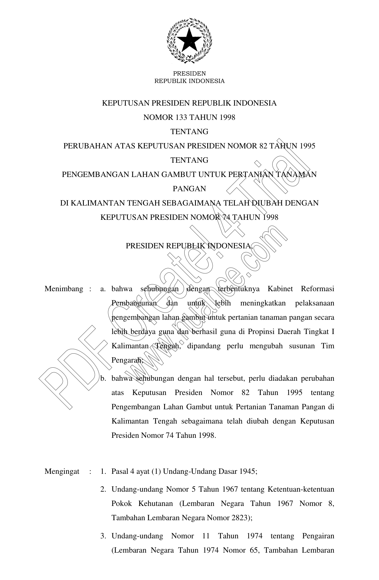 KEPPRES Nomor 133 Tahun 1998 | Keputusan Presiden Nomor 133 Tahun 1998 tentang PERUBAHAN ATAS KEPUTUSAN PRESIDEN NOMOR 82 TAHUN 1995 TENTANG PENGEMBANGAN LAHAN GAMBUT UNTUK PERTANIAN TANAMAN PANGAN DI KALIMANTAN TENGAH SEBAGAIMANA TELAH DIUBAH DENGAN KEPUTUSAN PRESIDEN NOMOR 74 TAHUN 1998